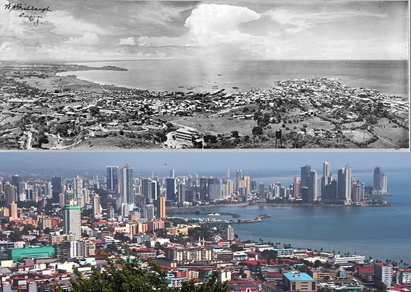 | Ảnh chụp thành phố Panama thập niên 30 của thế kỷ trước và hiện tại. Quang cảnh hoang vu đã được thay thế bằng rất nhiều tòa nhà chọc trời. |