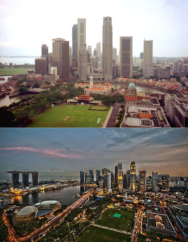 | Singapore năm 1990 và hiện tại - rất nhiều công trình mang tính biểu tượng đã mọc lên ở nơi đây. |