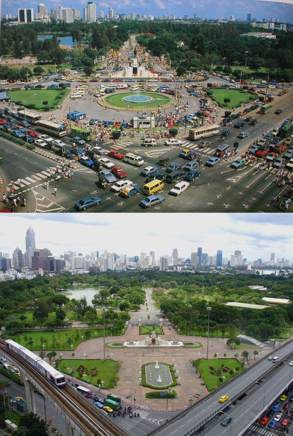 | Thủ đô Bangkok của Thái Lan năm 1988 và 2007: những tuyến đường trên cao được triển khai để giảm ách tắc cho thành phố. |
