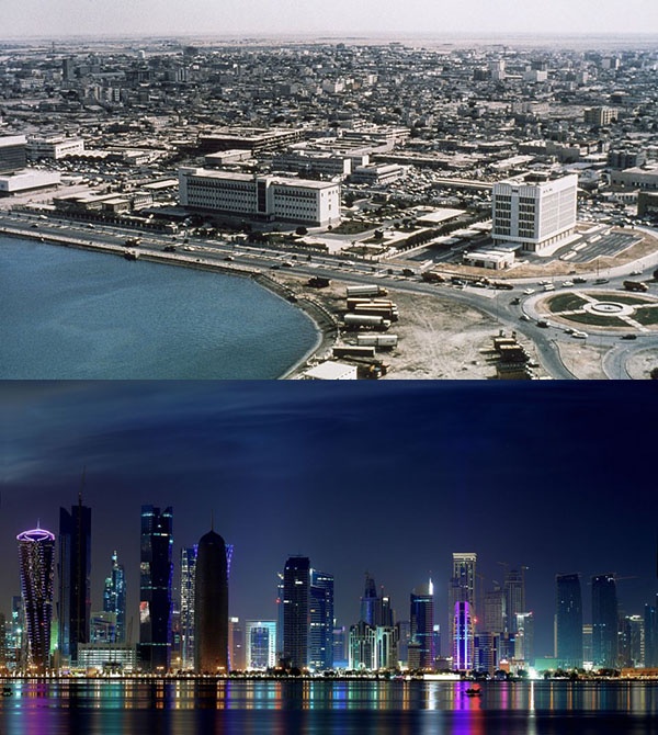 | Dĩ nhiên không thể không nhắc đến các thành phố Vùng Vịnh ở danh sách này. Trên hình là ảnh chụp Doha, Qatar năm 1977 và sau năm 2010. |