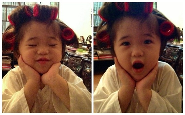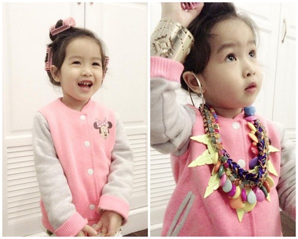 Lưu Hương Giang - Hồ Hoài Anh vốn không hào hứng với việc khoe hình con trên mặt báo. Gần đây khi bé đủ cứng cáp, họ mới quyết định chia sẻ hình ảnh, thông tin của con gái với mọi người. Bé tự làm điệu khi lấy vòng tay, vòng cổ của mẹ để "hóa trang" cho mình.