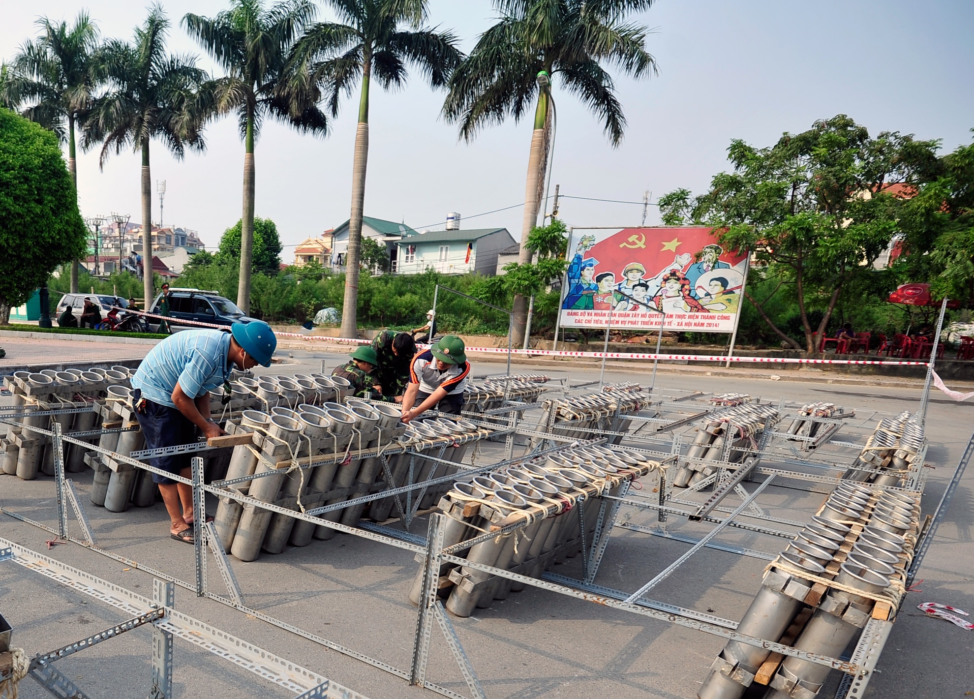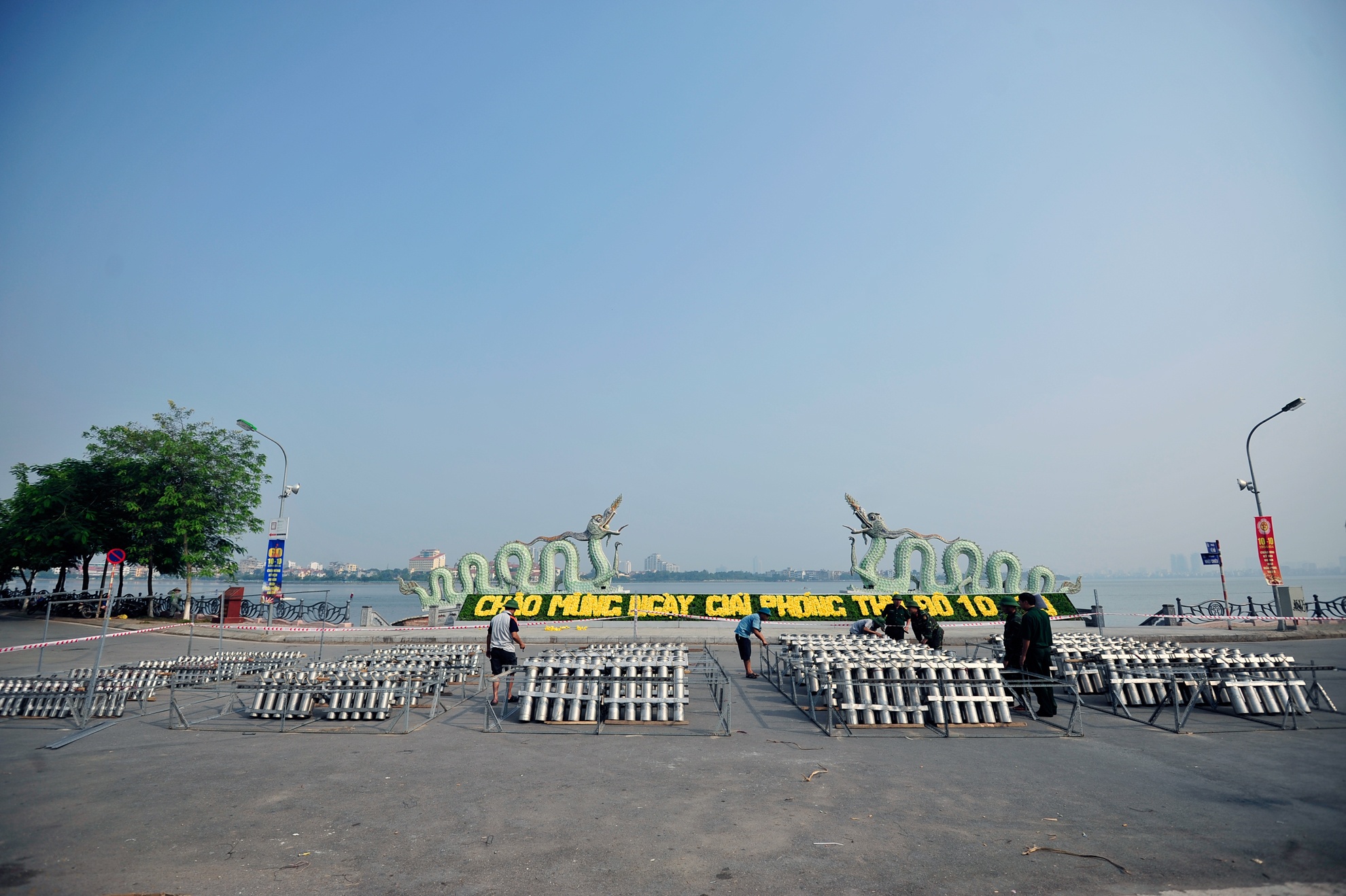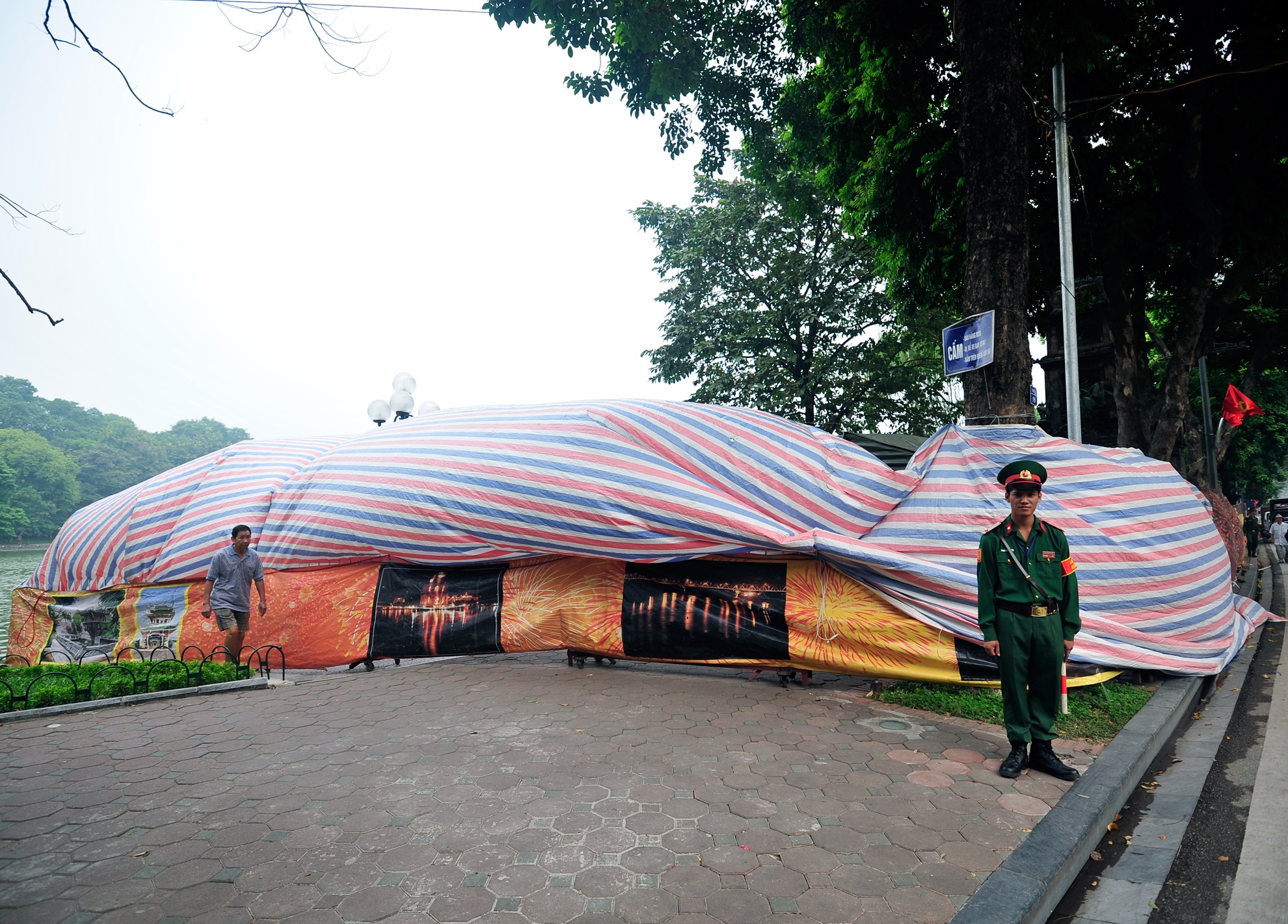 Các địa điểm bắn pháo hoa ở Hà Nội đã được lắp đặt xong, phủ bạt che kín và canh gác nghiêm ngặt chuẩn bị cho lễ chào mừng 60 năm giải phóng thủ đô vào 21h tối 10/10.