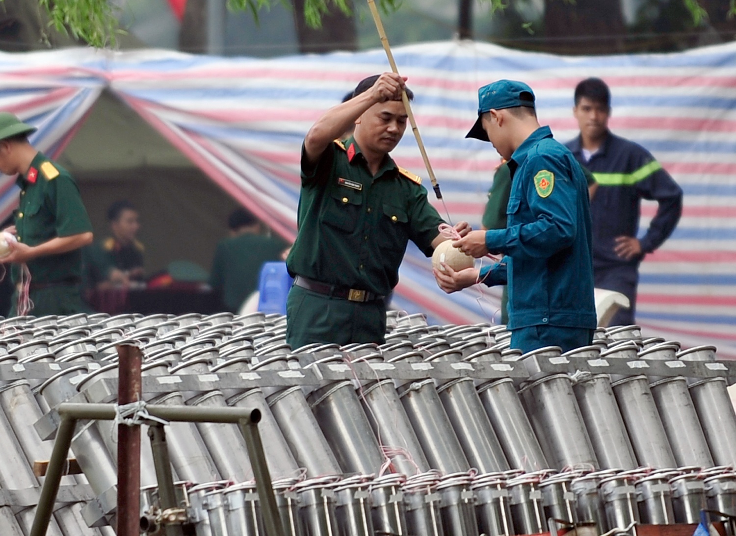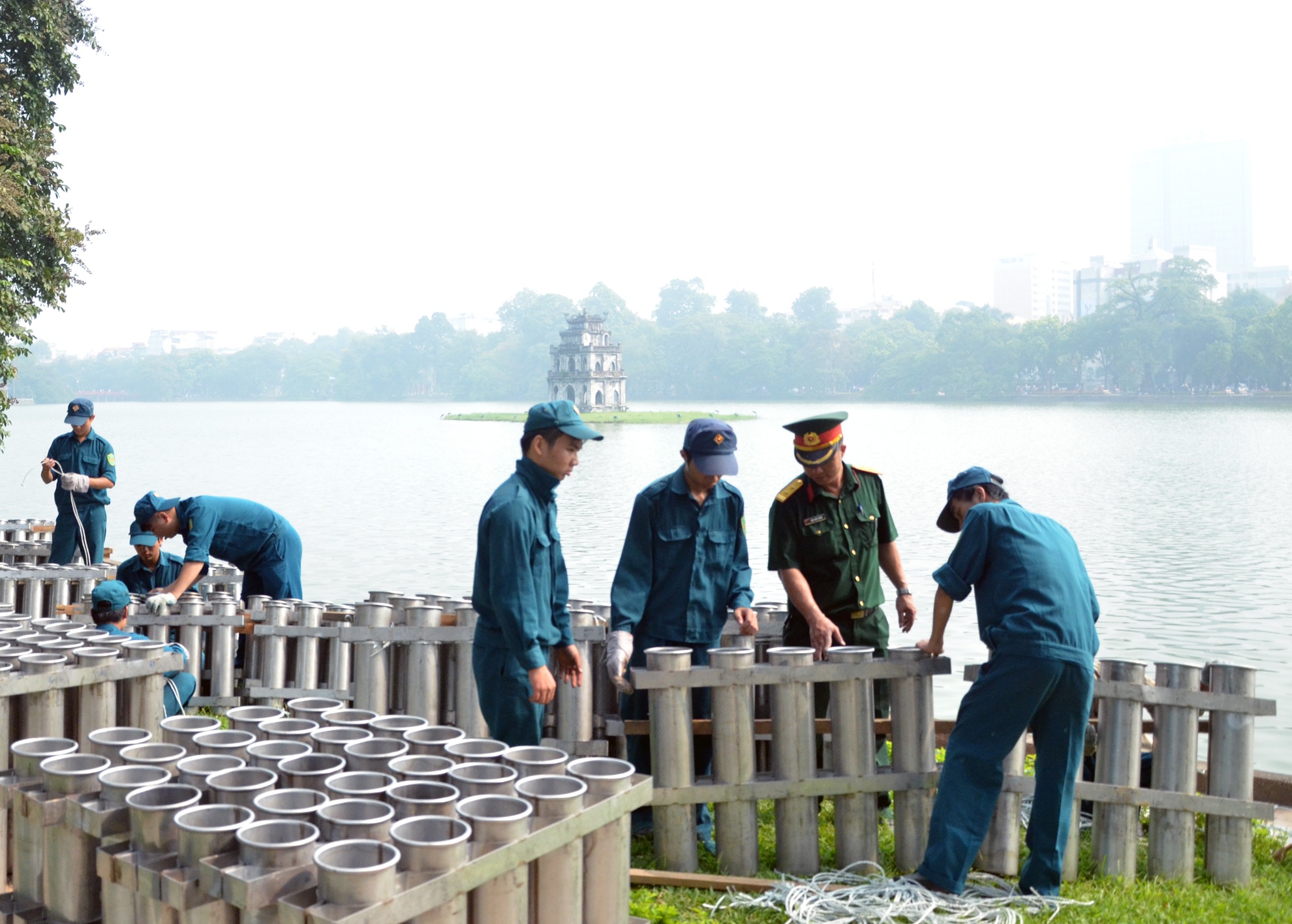 8h sáng 10/10, các chiến sĩ thuộc Bộ tư lệnh thủ đô cùng lực lượng dân quân tự vệ đang nhồi những quả pháo vào ống phóng tại khu vực điểm bắn số 1 - hồ Gươm.