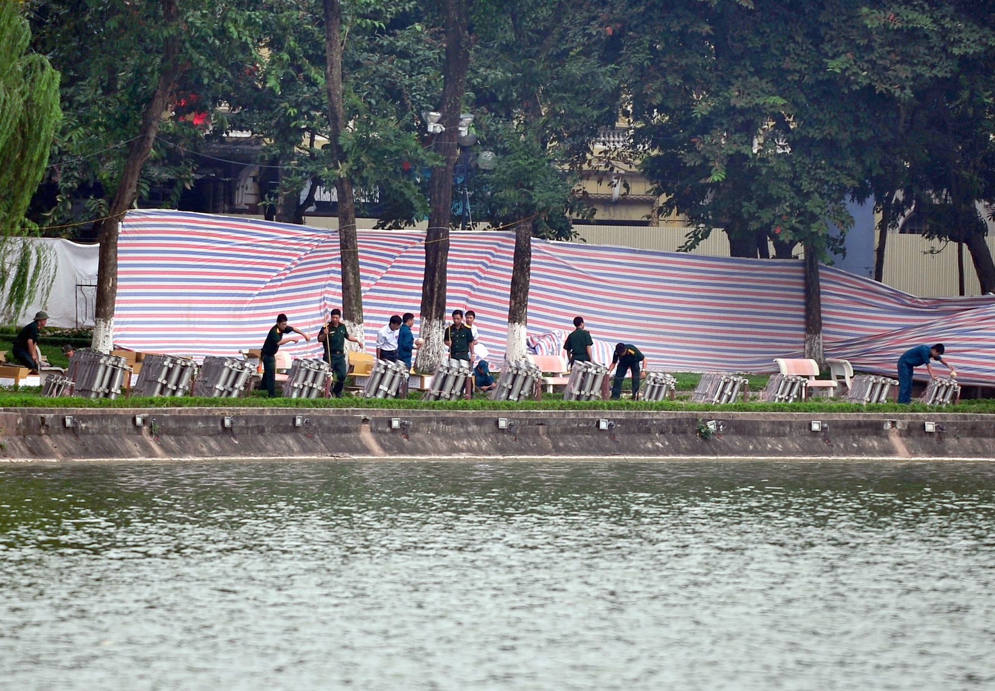 | Tại địa điểm hồ Tây (Lạc Long Quân) công tác lắp đặt đã được tiến hành từ hôm trước (sáng 9/10). |