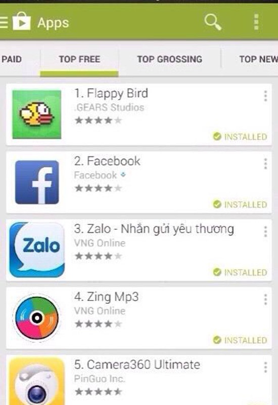 | Flappy Bird, Zalo, Zing MP3... là những ứng dụng Việt đứng đầu trên bảng xếp hạng Appstore. |