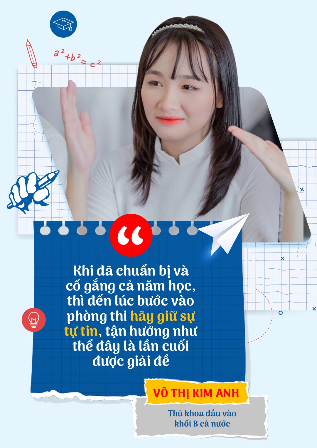 “Khi đã chuẩn bị và cố gắng cả năm học, đến lúc bước vào phòng thi, thí sinh hãy giữ sự tự tin và tận hưởng như thể đây là lần cuối được giải đề. Như vậy, bạn sẽ cố gắng hết sức mình”, Kim Anh nhấn mạnh.