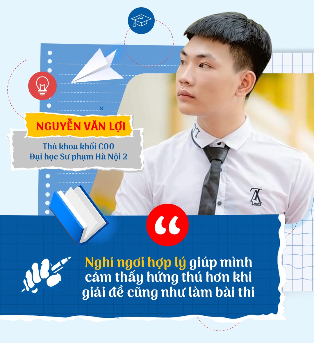 Giữ tinh thần thoải mái tiếp tục là bí quyết đầy “tâm đắc” của thủ khoa đầu vào khối C00 Đại học Sư phạm Hà Nội 2 - Nguyễn Văn Lợi. Nam sinh nhắn nhủ sĩ tử không nên hồi hộp, lo lắng mà cần bình tĩnh hoàn thành đề thi từ câu dễ đến khó để kiểm soát thời gian hiệu quả. Khi lỡ quên kiến thức, thí sinh cần bình tĩnh bỏ qua và quay lại tìm đáp án nếu dư thời gian.