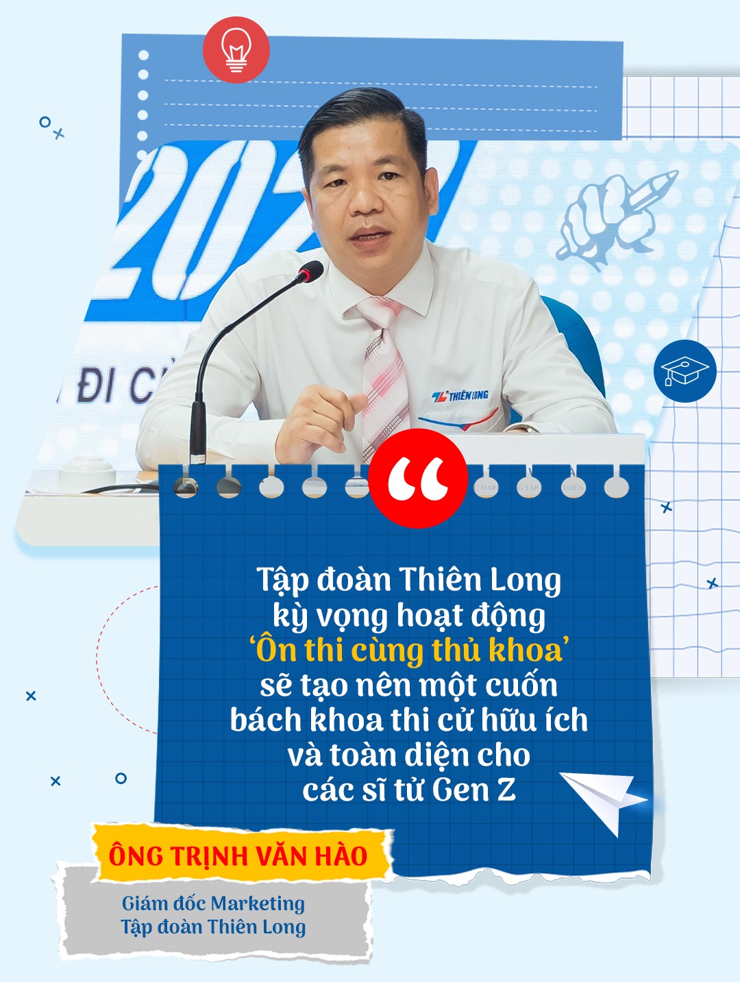 “Các thủ khoa khối thi năng khiếu cũng chia sẻ kinh nghiệm của mình - đây là điều khá hiếm thấy trước đây. Tập đoàn Thiên Long kỳ vọng hoạt động này tạo nên một cuốn bách khoa thi cử hữu ích và toàn diện cho các sĩ tử Gen Z”, ông Trịnh Văn Hào nhấn mạnh.