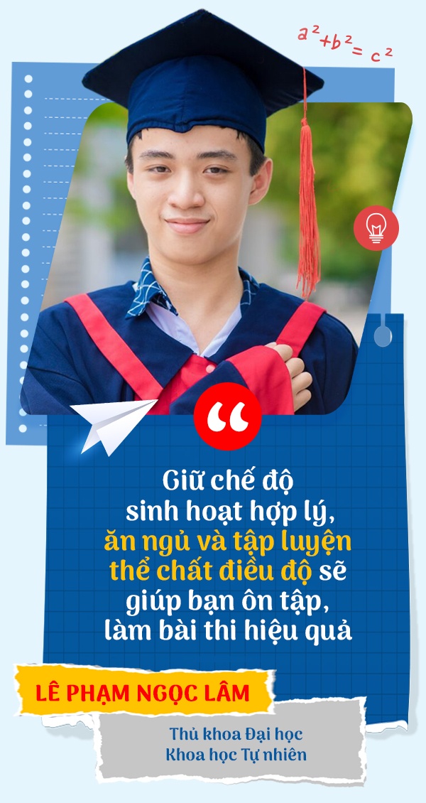 Để đạt được thành tích này, bên cạnh sự nỗ lực không ngừng trong 12 năm đèn sách, bí quyết của nam thủ khoa là giữ nhịp độ ôn luyện vừa phải, kết hợp ăn ngủ điều độ, nhất là những ngày cận kỳ thi.