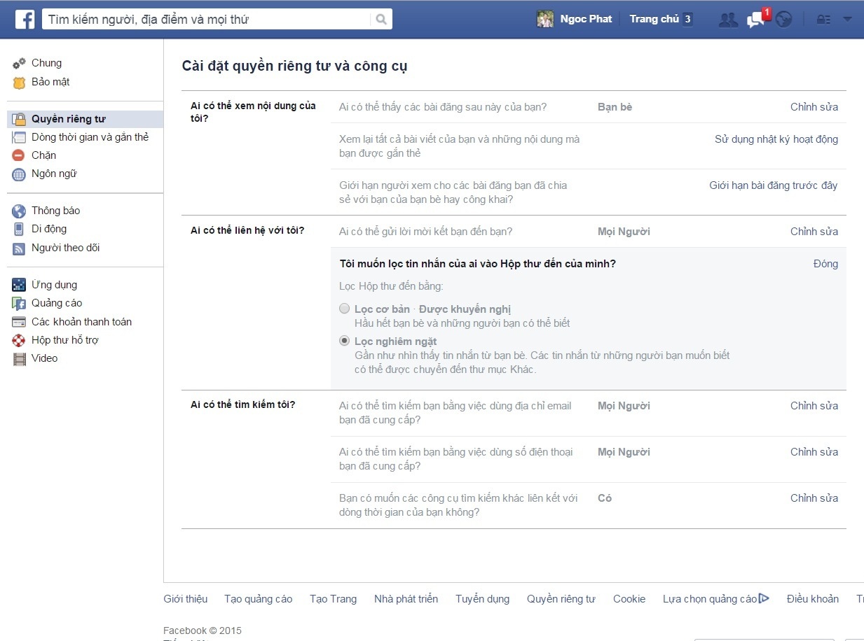 Bước 2: Tại giao diện Cài đặt, chọn thẻ Quyền Riêng tư, ở mục Ai có thể liên hệ với tôi. Tiếp đó, người dùng ấn vào: "Tôi muốn lọc tin nhắn của ai vào Hộp thư đến của mình?".