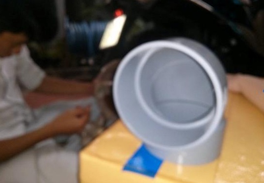 | Sau đó dùng dao rọc giấy tạo 2 lỗ tròn, cố định phần quạt để bàn với hướng của lồng quạt quay vào trong thùng xốp và đoạn ống nước hình chữ L. |