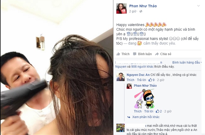 | Phan Như Thảo hào hứng khoe tấm ảnh được chồng sấy tóc vào sáng ngày 14/2. Cô hài hước khen doanh nhân Đức An là nhà tạo mẫu tóc chuyên nghiệp. Với người đẹp, đây là món quà ý nghĩa nhất. |