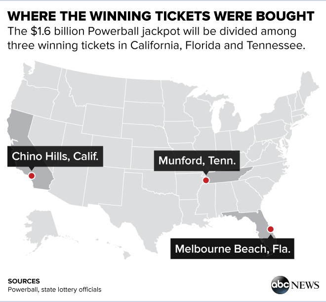 | Địa điểm 3 vé trúng giải độc đắc Powerball được bán ra. Ảnh: Powerball |