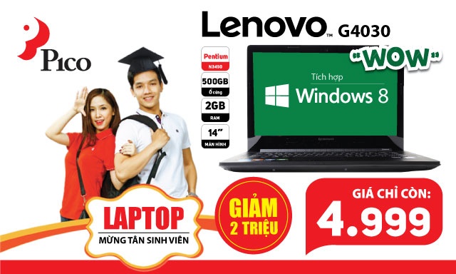 Đặc biệt, tại siêu thị điện máy Pico, sản phẩm laptop Lenovo G4030-80FY00DLVN với Win bản quyền sẽ chỉ còn 4,999 triệu đồng, giảm 2 triệu so với giá ban đầu. Giá của Asus X454LA-VX289D cũng được giảm tới 1,5 triệu đồng, chỉ còn 6,999 triệu đồng. Dell Inspiron N3551-70060249 chỉ còn 5,499 triệu đồng trong chương trình mừng tân sinh viên của Pico. Ngoài ra, khách hàng còn được tặng kèm phiếu giảm giá hoặc thẻ cào với trị giá lên tới 500.000 đồng.