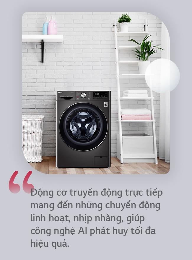 Ở máy giặt AI DD, LG đã ứng dụng động cơ truyền động trực tiếp để mang đến những chuyển động linh hoạt, nhịp nhàng, giúp công nghệ AI phát huy tối đa hiệu quả. Cụ thể, động cơ này được gắn trực tiếp vào lồng giặt giúp máy kiểm soát và xác định khối lượng quần áo chính xác hơn. Ngoài ra, động cơ trực tiếp giúp máy có tốc độ vắt cao, ít ồn và giảm thiểu rung lắc so với máy giặt sử dụng động cơ truyền động qua dây curoa.