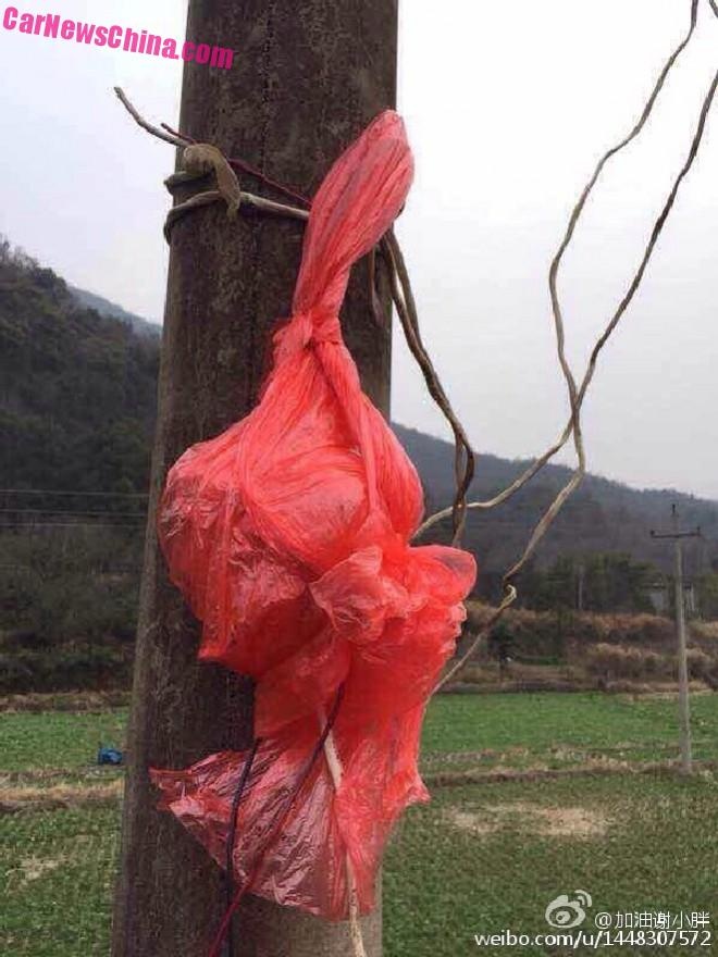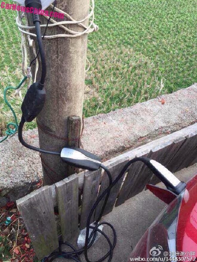 Hình ảnh được chụp tại đường lên núi gần Thành Đô, thủ phủ tỉnh Tứ Xuyên, Trung Quốc. Chủ xe đã tận dụng điện lưới công cộng và treo ổ điện vào cột bê tông để sạc ắc quy cho xe.