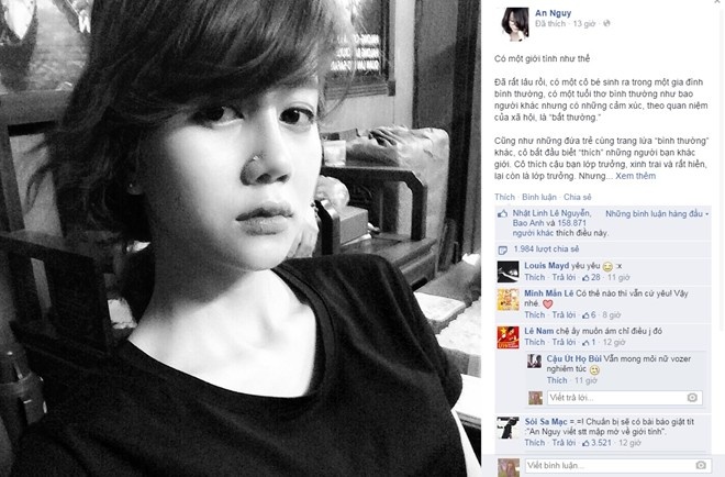 | Trước sự tranh cãi của cộng đồng mạng về giới tính của mình, An Nguy chỉ lặng lẽ đăng những bức thư đầy ngụ ý nói về một cô gái có cảm xúc lạ với những người bạn cùng giới, khi cô chỉ thích che chở cho họ. Sự chia sẻ nửa kín nửa hở này càng khiến nhiều người tò mò hơn về An Nguy, người thừa nhận "có tình cảm với cả nam lẫn nữ". |