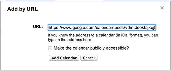 Bước 3: Gõ hoặc dán đường link sau vào ô URL: https://www.google.com/calendar/feeds/vdmtdcektajkqjk51vvda4ni4k%40group.calendar.google.com/public/basic