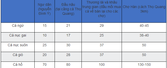 Từ cảng cá, hàng tiếp tục được thương lái phân phối lại cho các đầu mối tại các chợ trong TP. Đà Nẵng. Giá cá qua khâu trung gian này thường chênh lên 7.000-8.000 đồng/kg. Tại các chợ lẻ, giá cá lại được đẩy lên khá cao, thường khi đến tay người tiêu dùng tăng lên từ 10.000-15.000 đồng/kg nữa tùy theo khoảng cách từ cảng cá đến các chợ. “Ngay cả người quen của tui cũng phải mua cá với giá cao gấp nhiều lần giá tại cảng, ngư dân tụi tui cũng biết nhưng đâu thể thay đổi được gì. Mình vay tiền của đầu nậu nên phải bán cá cho họ, chấp nhận giá cá do họ ấn định chứ chẳng lẽ bỏ cho cá hư”, một chủ tàu nói.