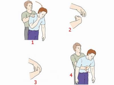Biện pháp vỗ lưng: Người sơ cứu quỳ, cho trẻ đứng, cúi đầu thấp, miệng há ra. Người sơ cứu quỳ một bên trẻ, một tay đỡ ngực, một tay vỗ 5 lần vào lưng trẻ ở vị trí giữa hai xương bả vai, nếu dị vật chưa ra thì phối hợp dùng biện pháp ép bụng.