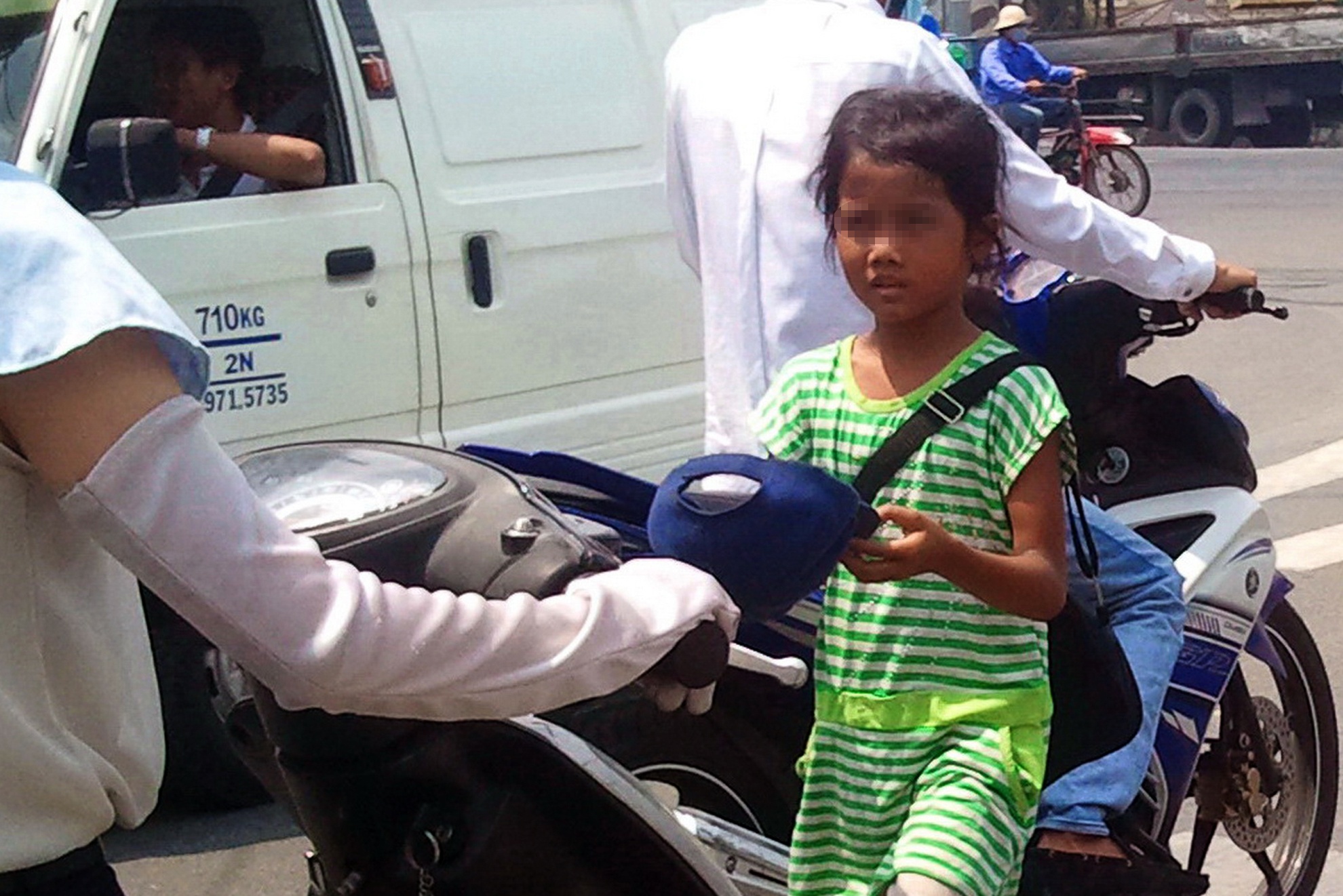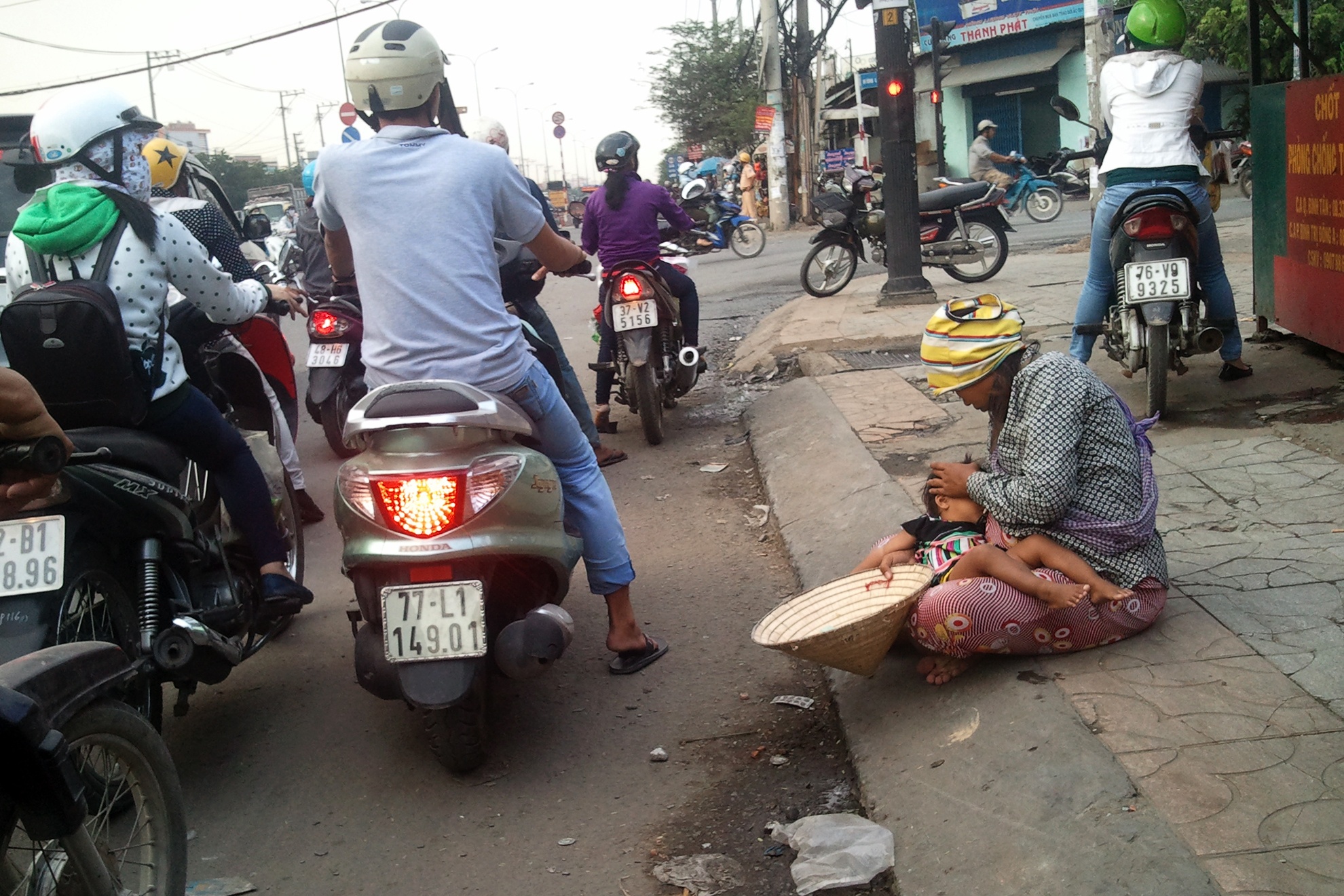 | Gần đây, tại một số quận, huyện ở TP.HCM xuất hiện trở lại các nhóm phụ nữ và trẻ em người Campuchia phơi nắng, tiếp cận người đi đường đang dừng đèn đỏ ở các ngã tư để xin tiền. Những nhóm "cái bang" này thường đứng tại cổng khu công nghiệp Vĩnh Lộc (phường Bình Hưng Hòa B, quận Bình Tân); ngã tư Trung Chánh (quận 12 và huyện Hóc Môn) và ngã tư Nguyễn Trãi - Nguyễn Văn Cừ, đường Trần Phú, An Dương Vương... (quận 1 và 5). Trong ảnh: Một cái bang "nhí" len lỏi giữa dòng ôtô, xe máy đang dừng đèn đỏ trước khu công nghiệp Vĩnh Lộc để xin tiền. |