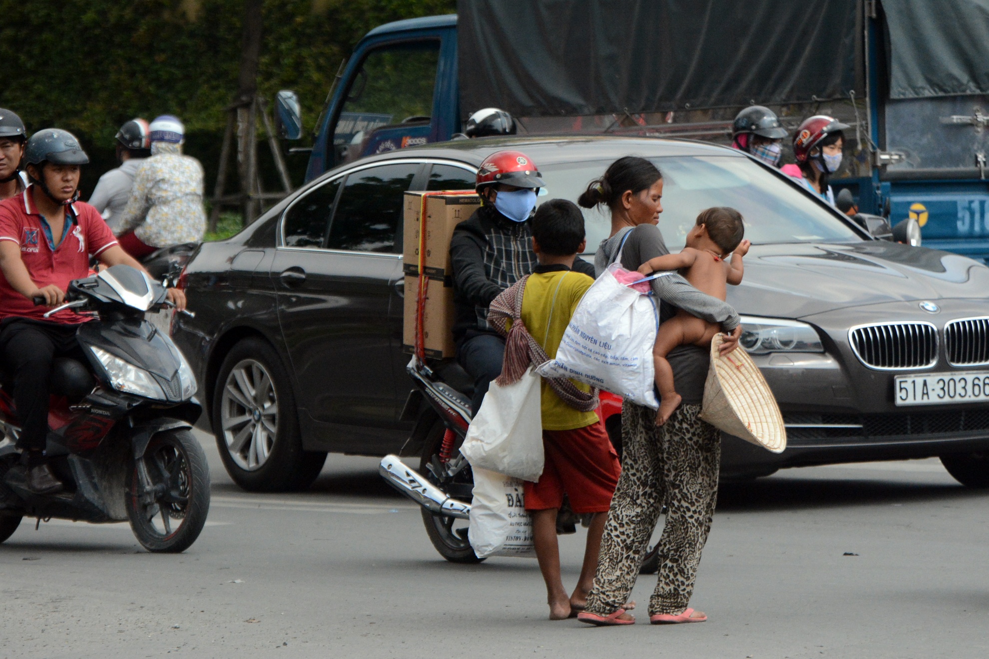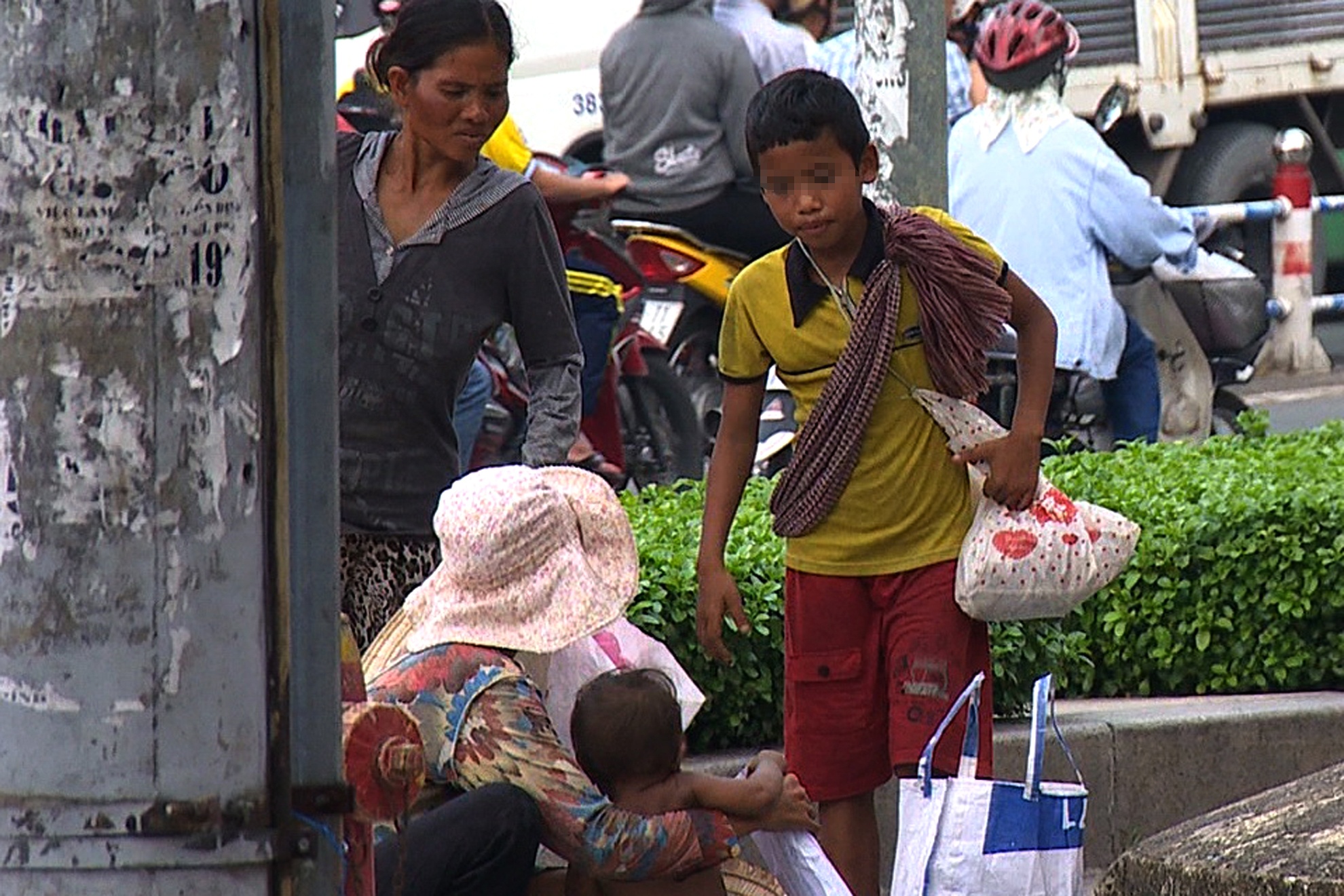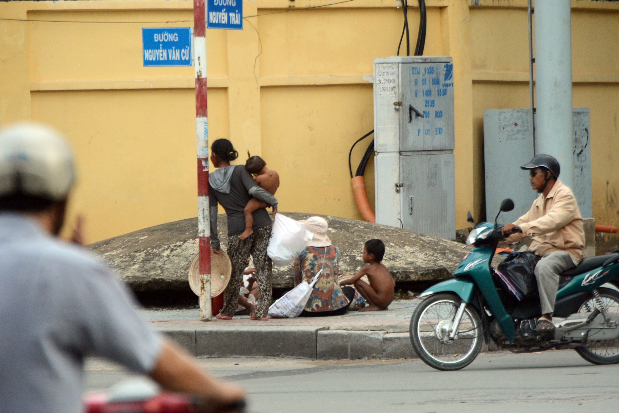 | Tại giao lộ Nguyễn Trãi - Nguyễn Văn Cừ (quận 1 và 5), một nhóm gồm hai phụ nữ mang theo 4 đứa trẻ ngồi bên cột đèn tín hiệu giao thông, lượn lờ quanh khu vực để xin tiền người đi đường. |