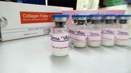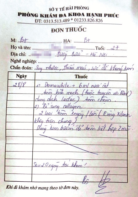 Đơn thuốc được kê chi tiết là Derma White + 6ml nước cất tiêm tĩnh mạch (hoặc truyền với 50ml dung dịch Lactac) tiêm chậm, bổ sung thêm collagen. Hai loại kể trên được “bác sĩ” yêu cầu tiêm 3 ngày/lần (riêng xilanh không trộn chung), dùng kim bướm để tiêm kết hợp 2 mũi.
