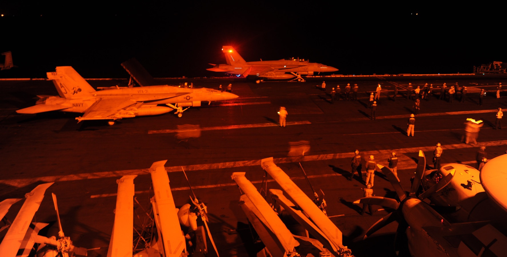 | Phản lực chiến đấu Mỹ cất cánh từ tàu sân bay trong chiến dịch không kích IS. Ảnh: Getty |