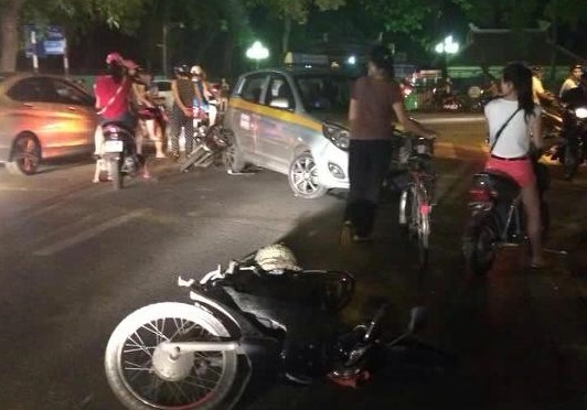 Cú va chạm mạnh khiến chiếc Dream và Honda Wave màu đen đổ xuống đường. Tài xế tiếp tục rồ ga, lao về phía trước thì đâm trúng chiếc Airblade, đẩy xe máy cắm vào đuôi taxi cùng chiều. Cả cụm xe lao về phía trước, tông trúng vào một xe máy khác.