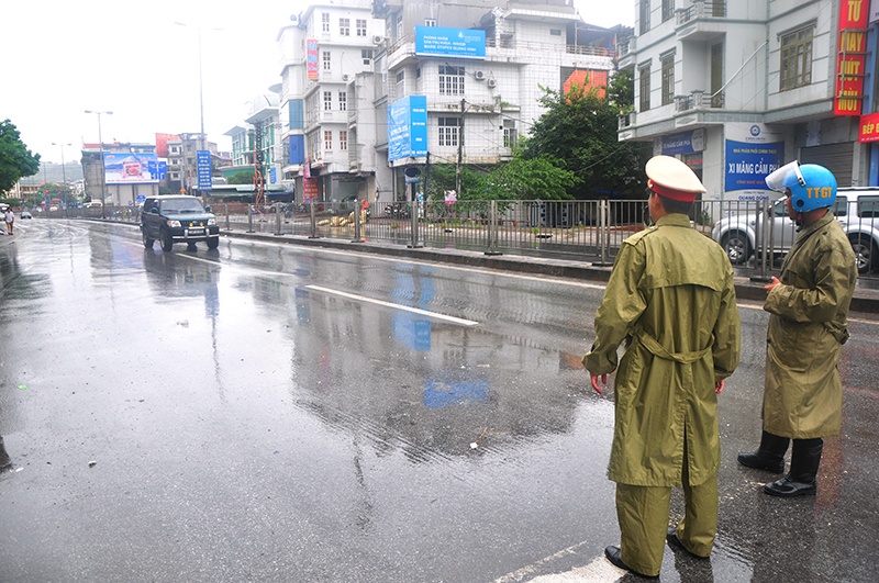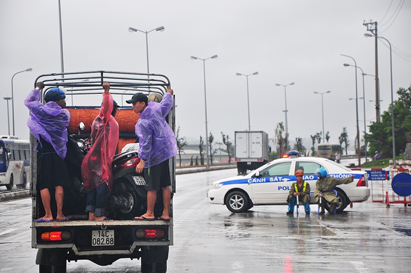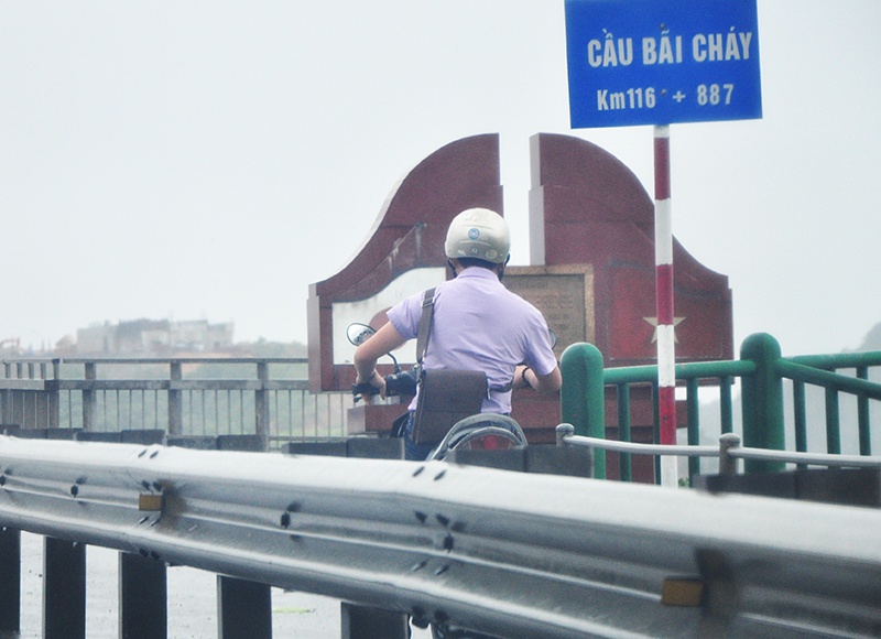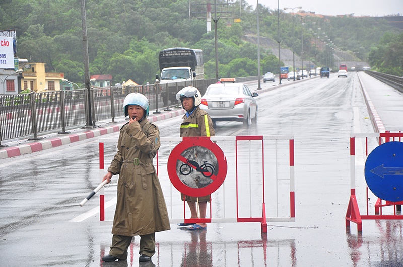 | Lệnh cấm cầu Bãi Cháy sẽ được gỡ bỏ khi thời tiết thuận lợi. Lực lượng CSGT, Thanh tra Giao thông làm nhiệm vụ tại hai bên đầu cầu Bãi Cháy. |