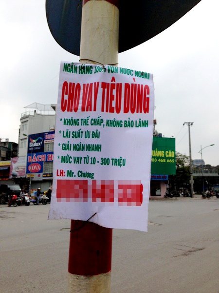 | Dễ dàng bắt gặp các biển quảng cáo như thế này từ trung tâm thành phố đến các vùng ngoại ô. Những tấm biển quảng cáo tín dụng này dường như không được xử lý, gỡ bỏ. Chúng sẽ tồn tại ở các ngã tư cho đến khi tự rơi xuống vì mưa gió, hay được thay bằng các biển quảng cáo khác mới hơn có nội dung tương tự. |