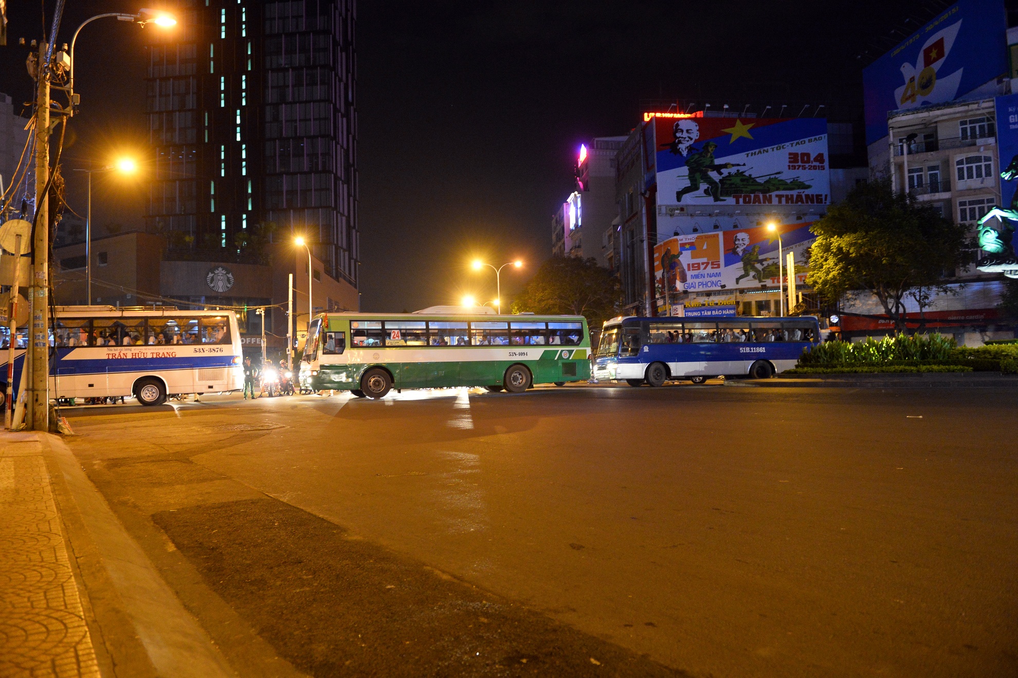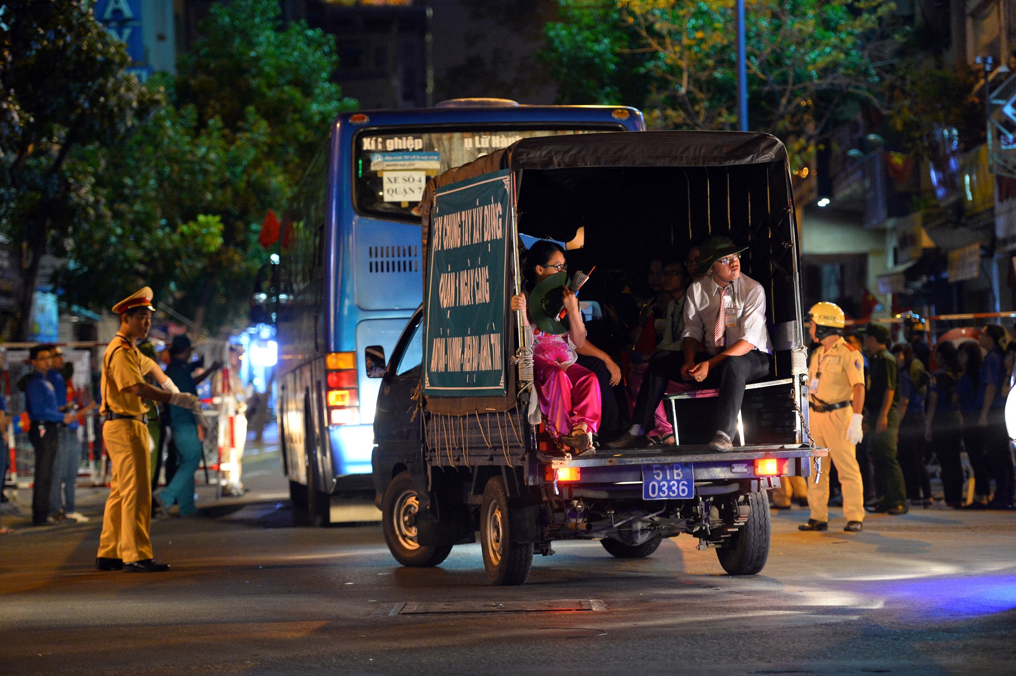 | 4h sáng, lần lượt từng đoàn xe chở các đội tham dự nghi lễ diễu binh, diễu hành chào mừng 40 năm giải phóng miền Nam tiến về phía khán đài tại Công viên 30/4. |