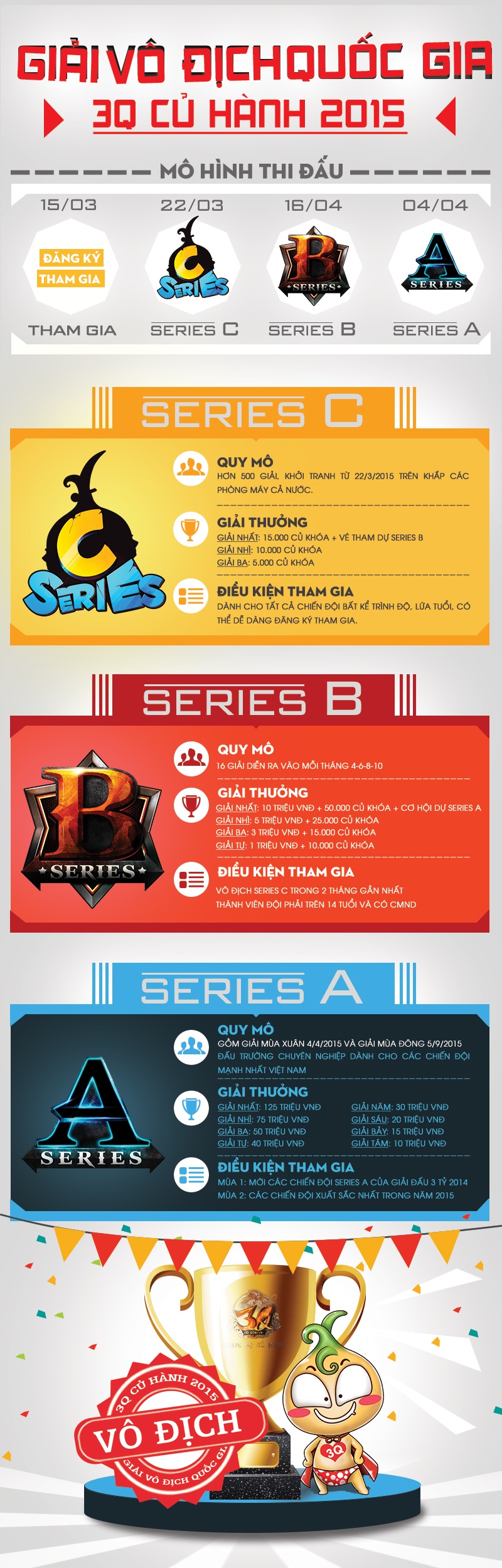 Tiếp nối thành công các mùa trước, thông tin Giải vô địch quốc gia 3Q Củ Hành 2015 sắp khởi tranh thu hút hàng triệu lượt quan tâm và theo dõi. Có mức đầu tư lớn, phong cách tổ chức chuyên nghiệp và giải thưởng giá trị cao, giải đấu là sân chơi thể thao điện tử lớn nhất dành riêng cho game thủ MOBA Việt. Tham gia miễn phí, dễ dàng đăng ký, người chơi quan tâm có thể truy cập ngay tại đây.
