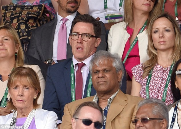 | Diễn viên kiêm MC truyền hình, Rob Brydon (đeo kính) có vẻ mệt mỏi khi chứng kiến cuộc so tài giữa hai tay vợt ở set 3. |