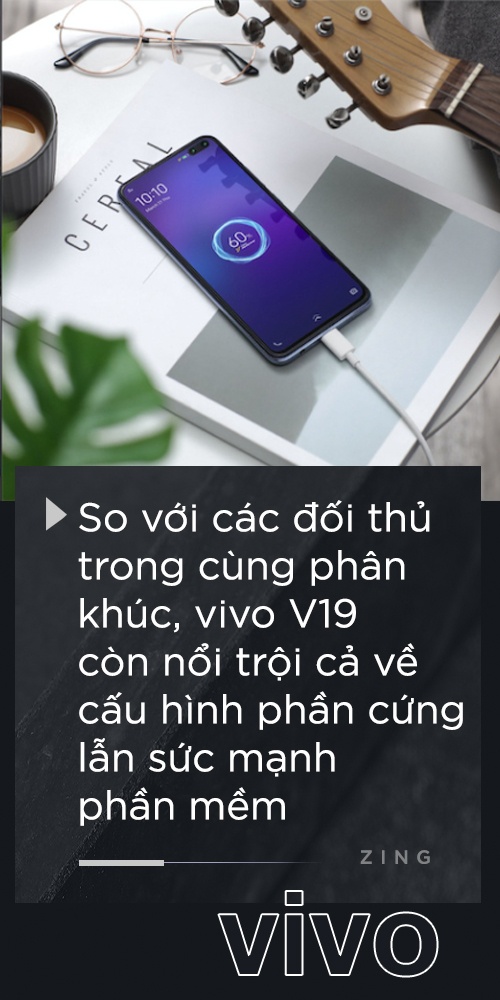 So với các đối thủ trong cùng phân khúc, vivo V19 không chỉ ấn tượng về camera mà còn ghi điểm về cả cấu hình phần cứng lẫn sức mạnh phần mềm. Máy chạy hệ điều hành Funtouch OS 10 được tuỳ biến từ Android 10 mới nhất. V19 cũng là smartphone hiếm hoi trong tầm giá dưới 9 triệu được trang bị chip Snapdragon 712, 8 nhân. Đây là con chip cho hiệu năng cao, được sản xuất trên tiến trình 10 nm thay vì 11 nm như nhiều con chip phổ thông trên thị trường.