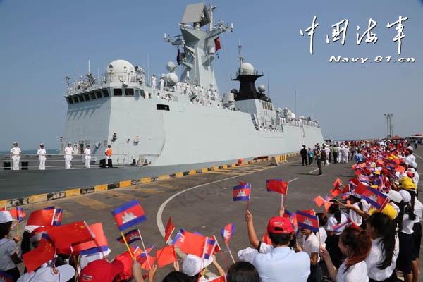 | Người dân Campuchia chào đón tàu chiến Trung Quốc lần đầu cập cảng nước này. Ảnh: Navy.81 |
