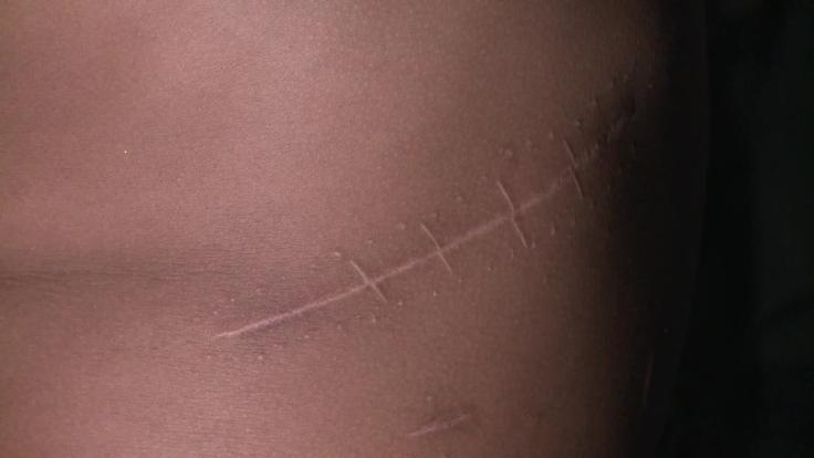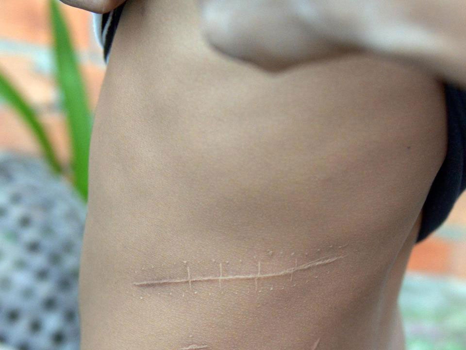 | Vết rạch lấy thận trên cơ thể Chhay, một trong những nạn nhân buôn bán nội tạng bất hợp pháp đầu tiên được phát hiện ở Campuchia. Ảnh: AFP |