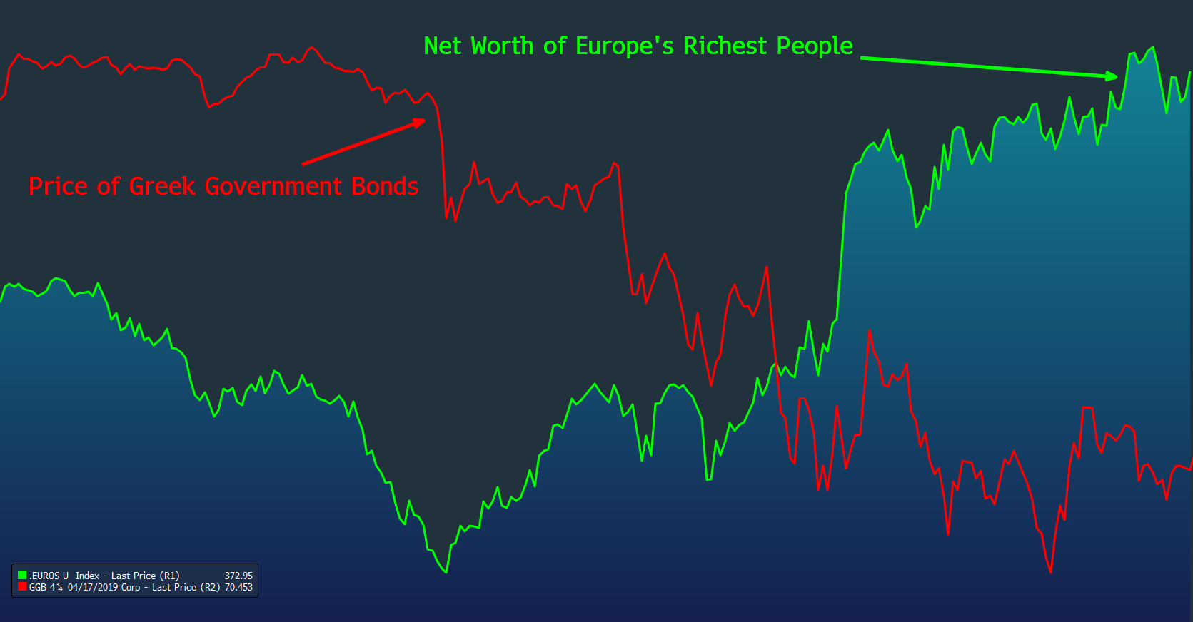 | Xu hướng trái ngược giữa tài sản của các tỷ phú tại châu Âu và giá trái phiếu của Hy Lạp. |