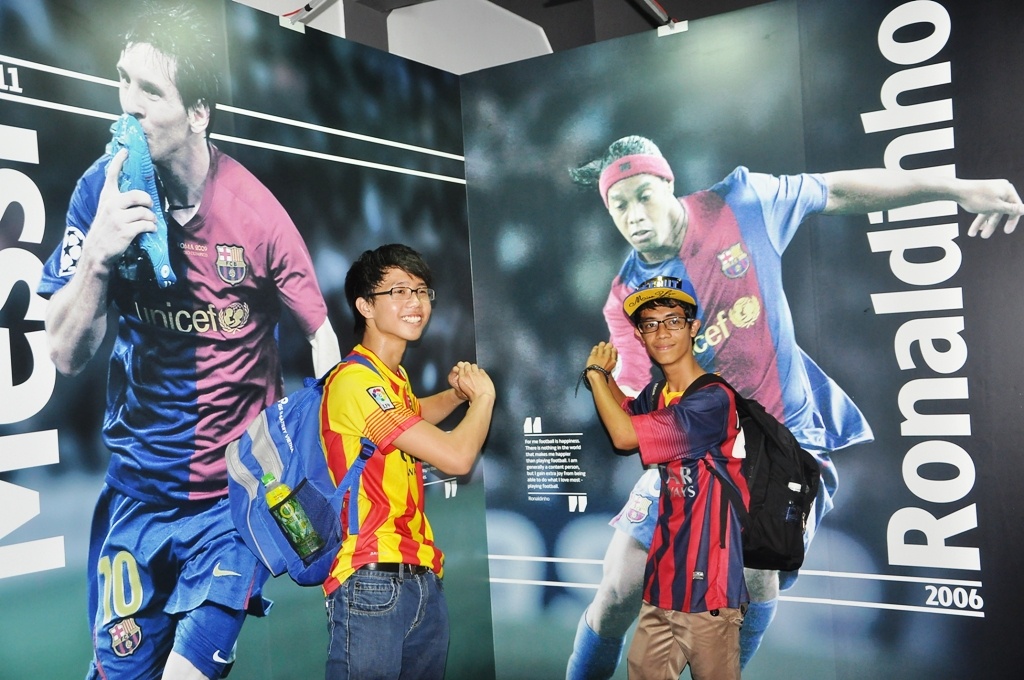 | 2 fan Barcelona hào hứng tạo dáng cùng hình ảnh của 2 thần tượng Ronaldinho và Messi. |