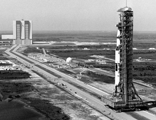 | Saurn V và lớp Apollo 11 trên đường đến bệ phóng 39A. |