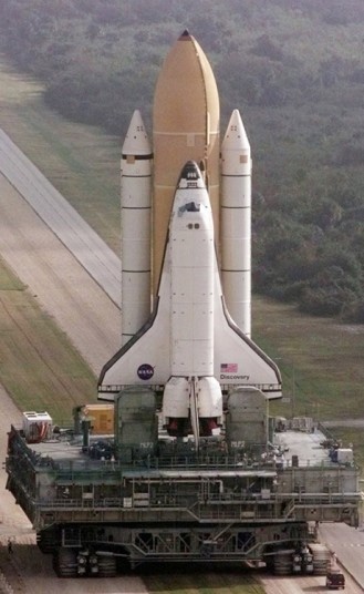 | Tàu con thoi Discovery đang di chuyển trên bệ phóng vận chuyển cho hành trình tới bệ phóng tại trung tâm vũ trụ Kennedy năm 1999. |