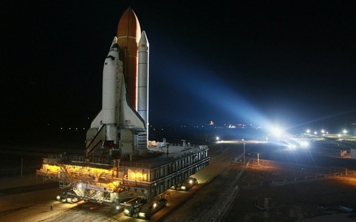 | Tàu con thoi Discovery di chuyển đến bệ phóng 39B tại Trung tâm vũ trụ Kennedy vào tháng 5/2006. |