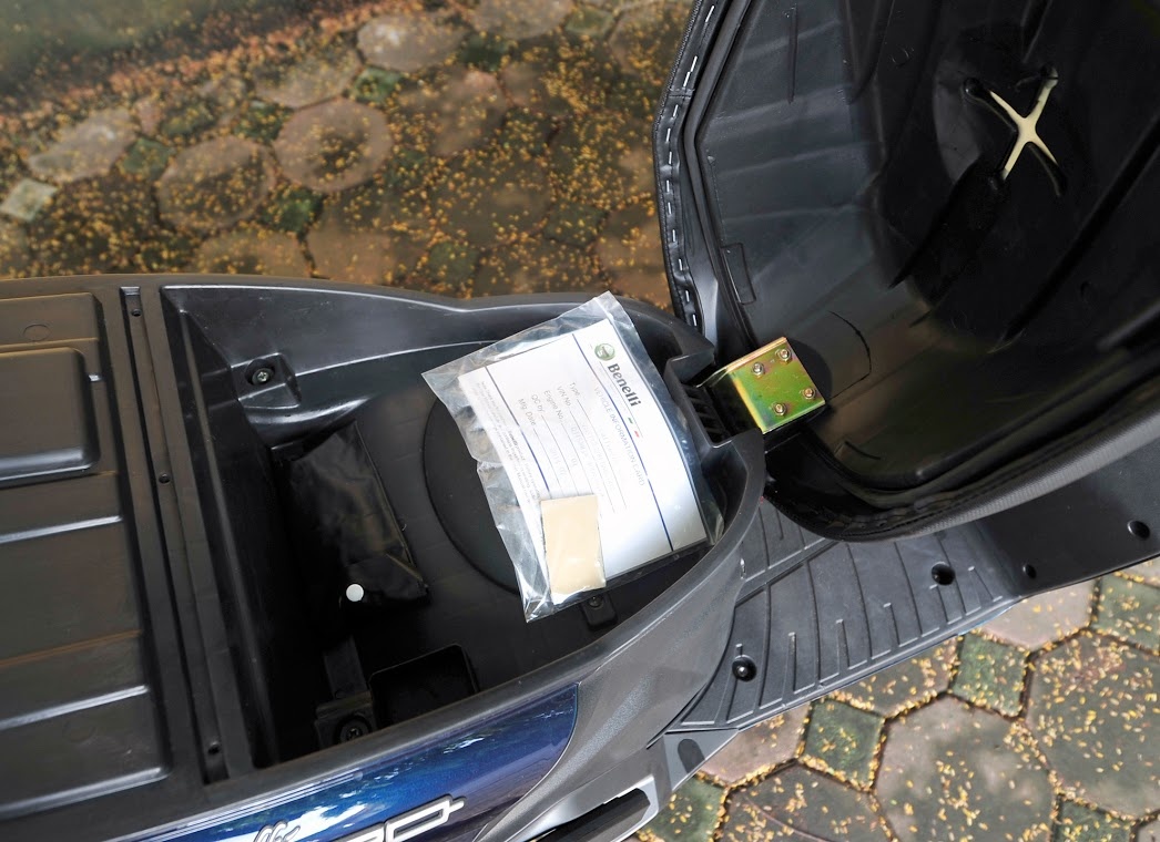 | Cốp đựng đồ bên dưới yên xe được thiết kế nông, tuy nhiên vẫn để vừa mũ bảo hiểm nửa đầu, do phần trên yên xe được thiết kế dạng vòm rộng. |