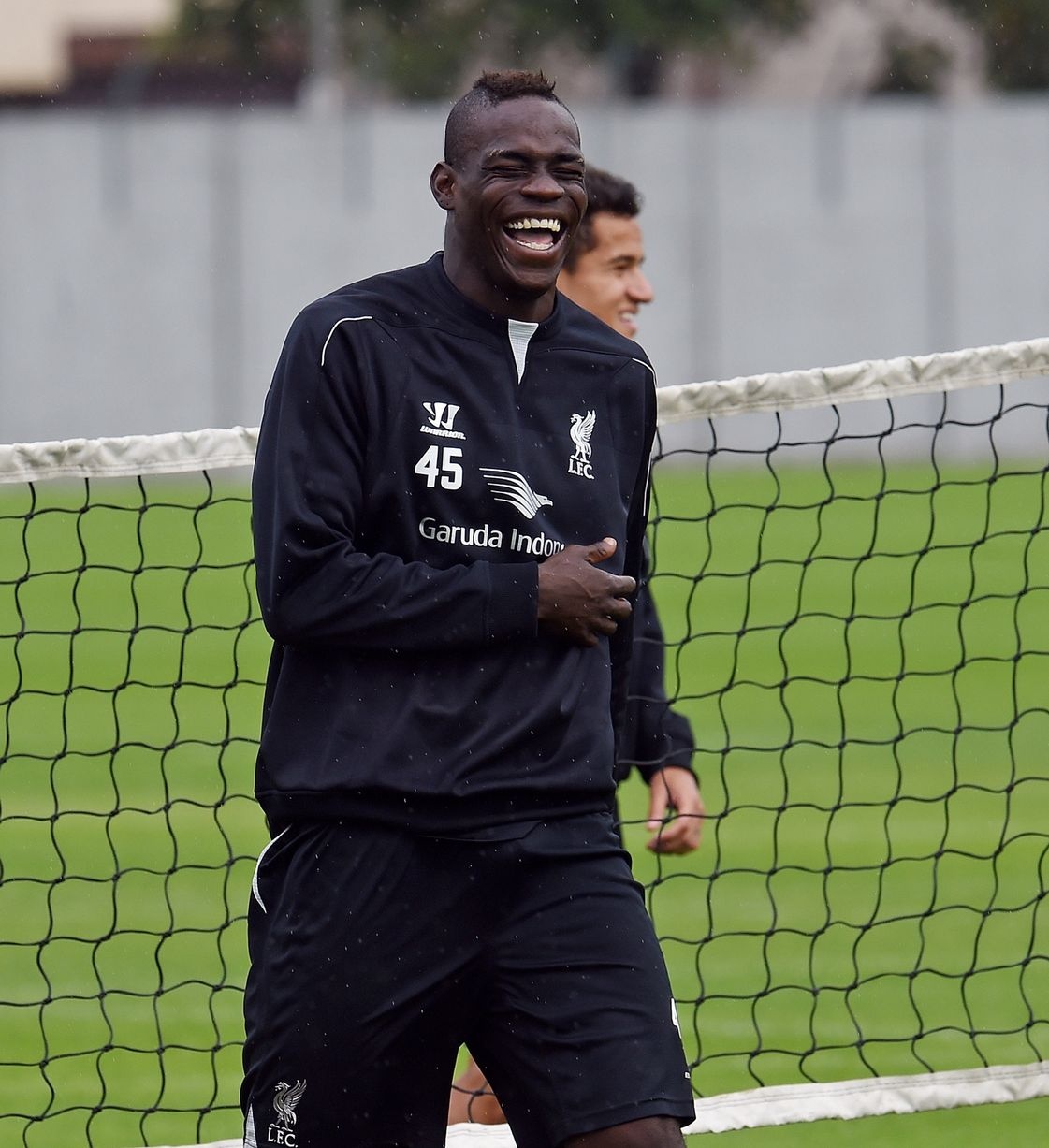 | Balotelli cười tươi rói trong buổi tập luyện cùng Liverpool. Ngôi sao người Italy không mấy khó khăn để thích nghi với đội bóng mới. |