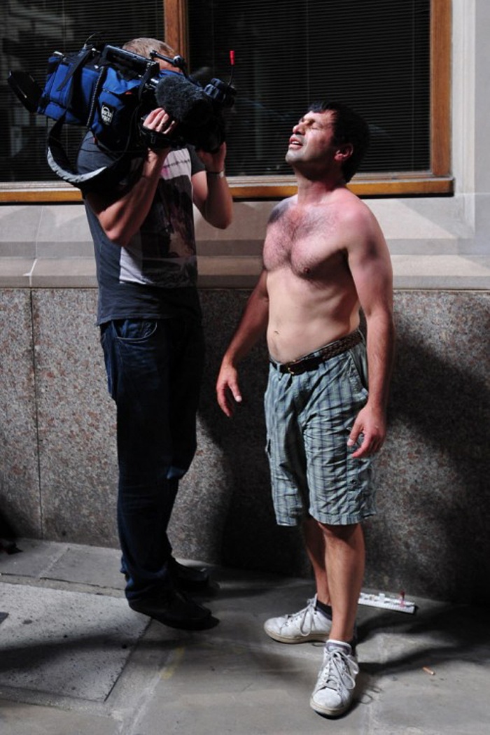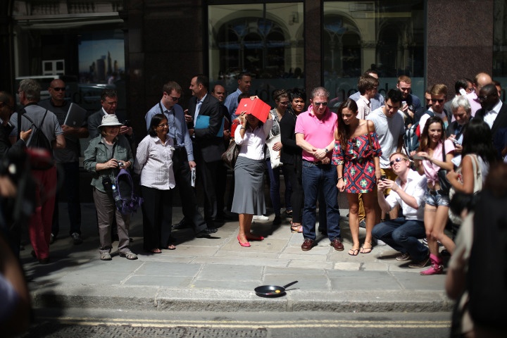 | Người dân London rán trứng bằng ánh sáng từ tòa nhà. Nhiều người tận dụng nguồn năng lượng này để chế biến món ăn và thưởng thức ngay tại chỗ. Ảnh: Getty Images. |
