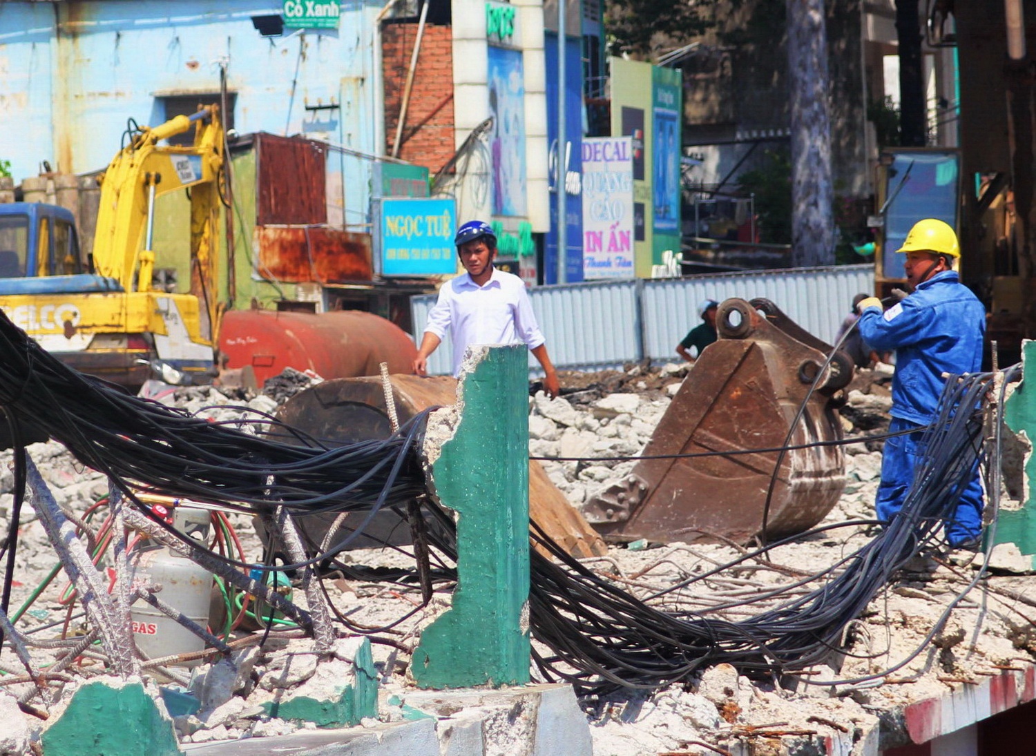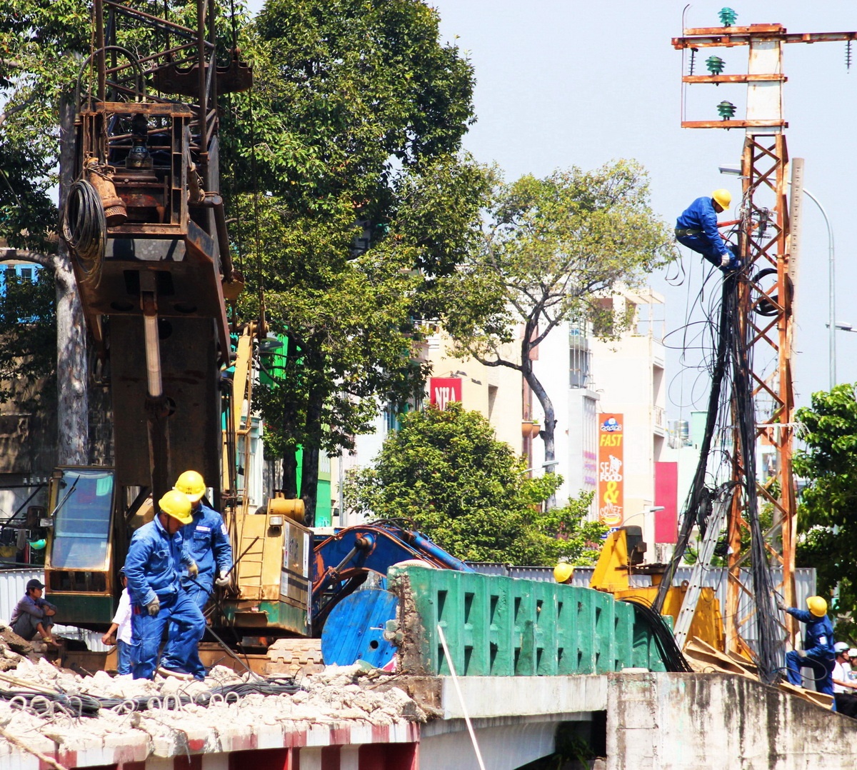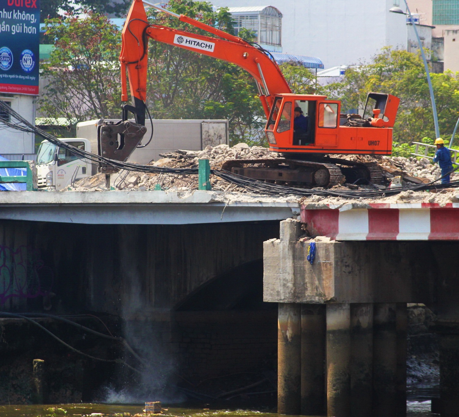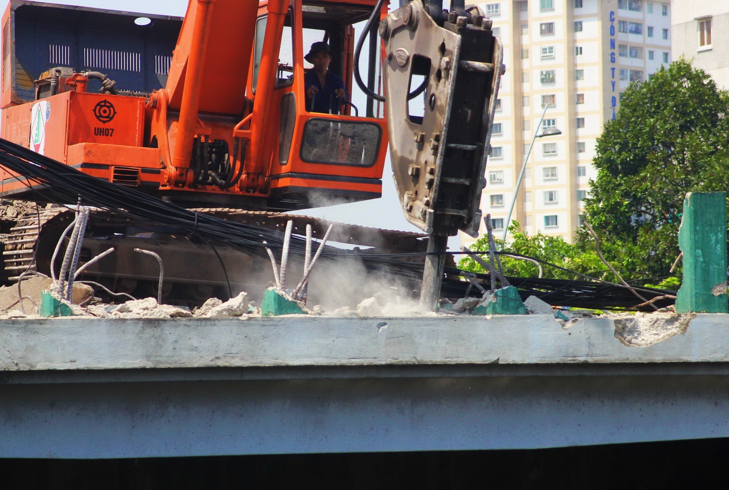 Đơn vị thi công cầu Bông (Q.1 - Q.Bình Thạnh), cầu Hậu Giang (Q.6) đang khẩn trương tiến hành tháo dỡ kết cấu bê tông thân cầu cũ để xây cầu mới.