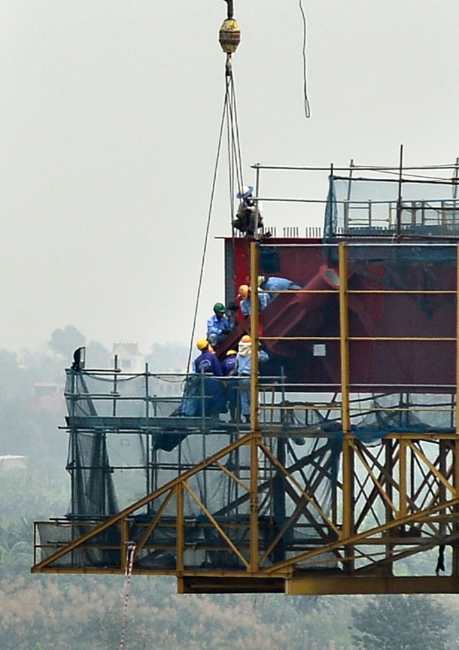 Các công nhân làm việc trên mép nối giữa hai trụ tháp khổng lồ.