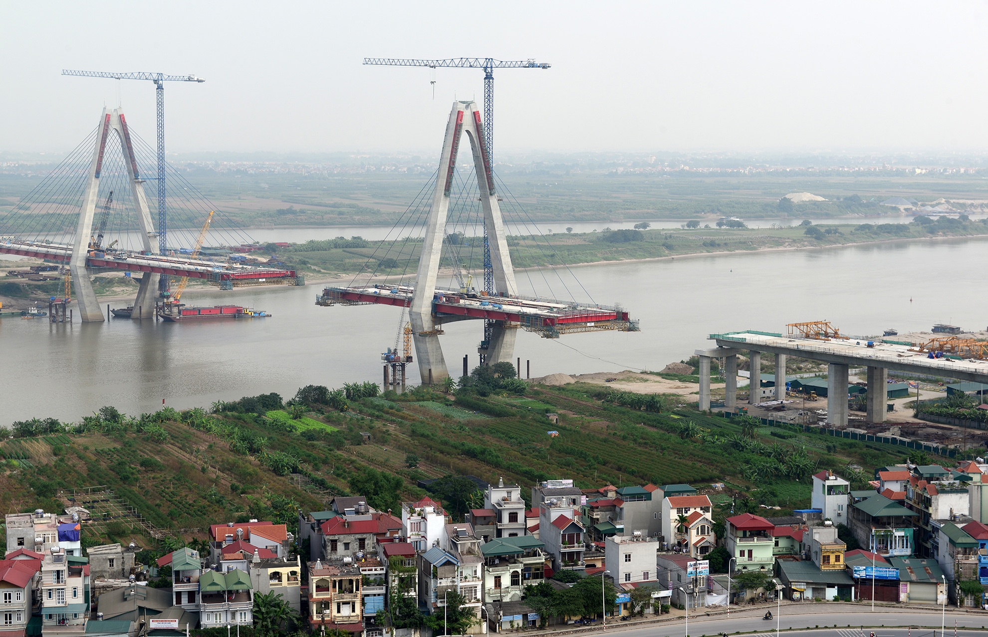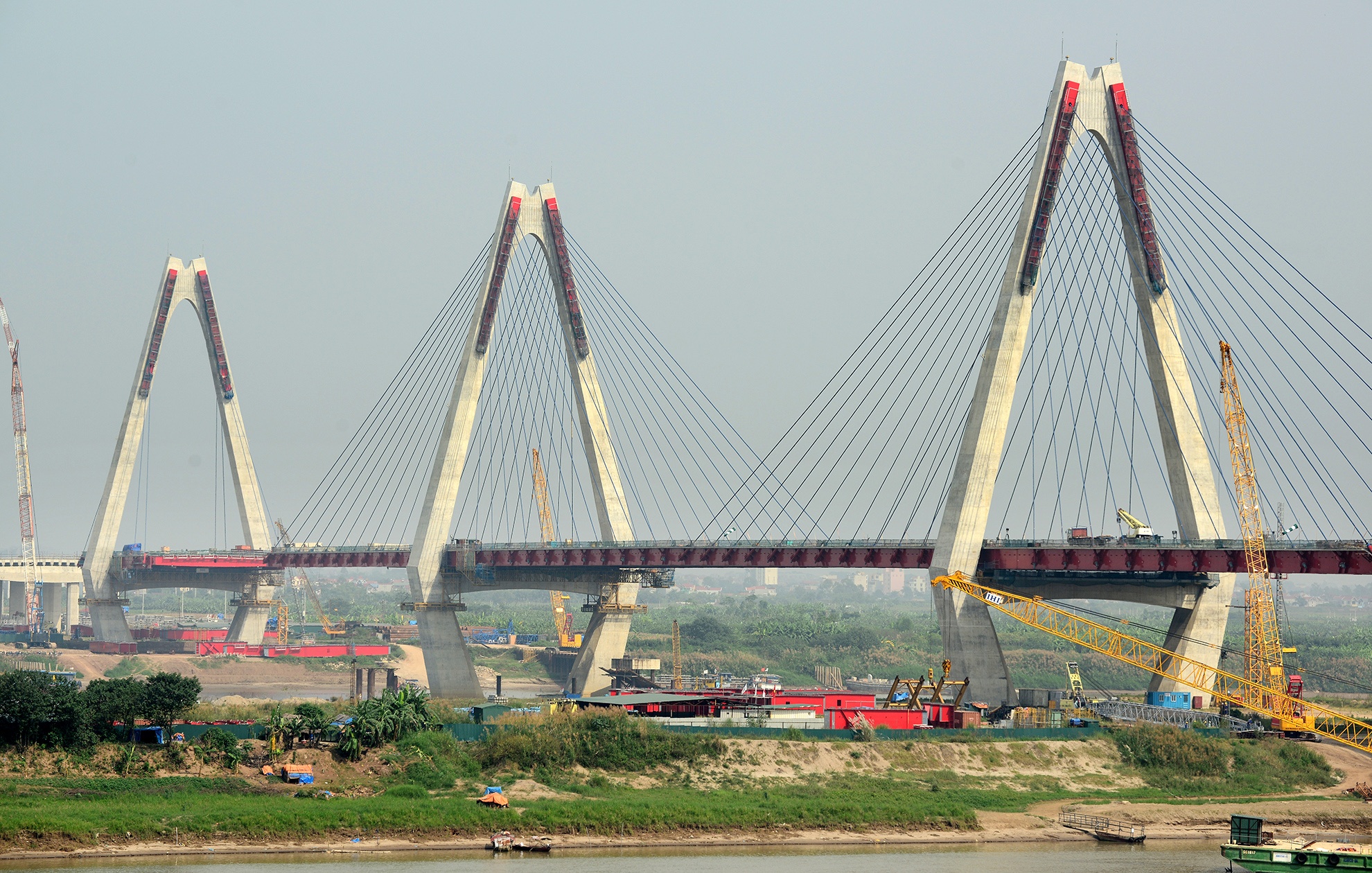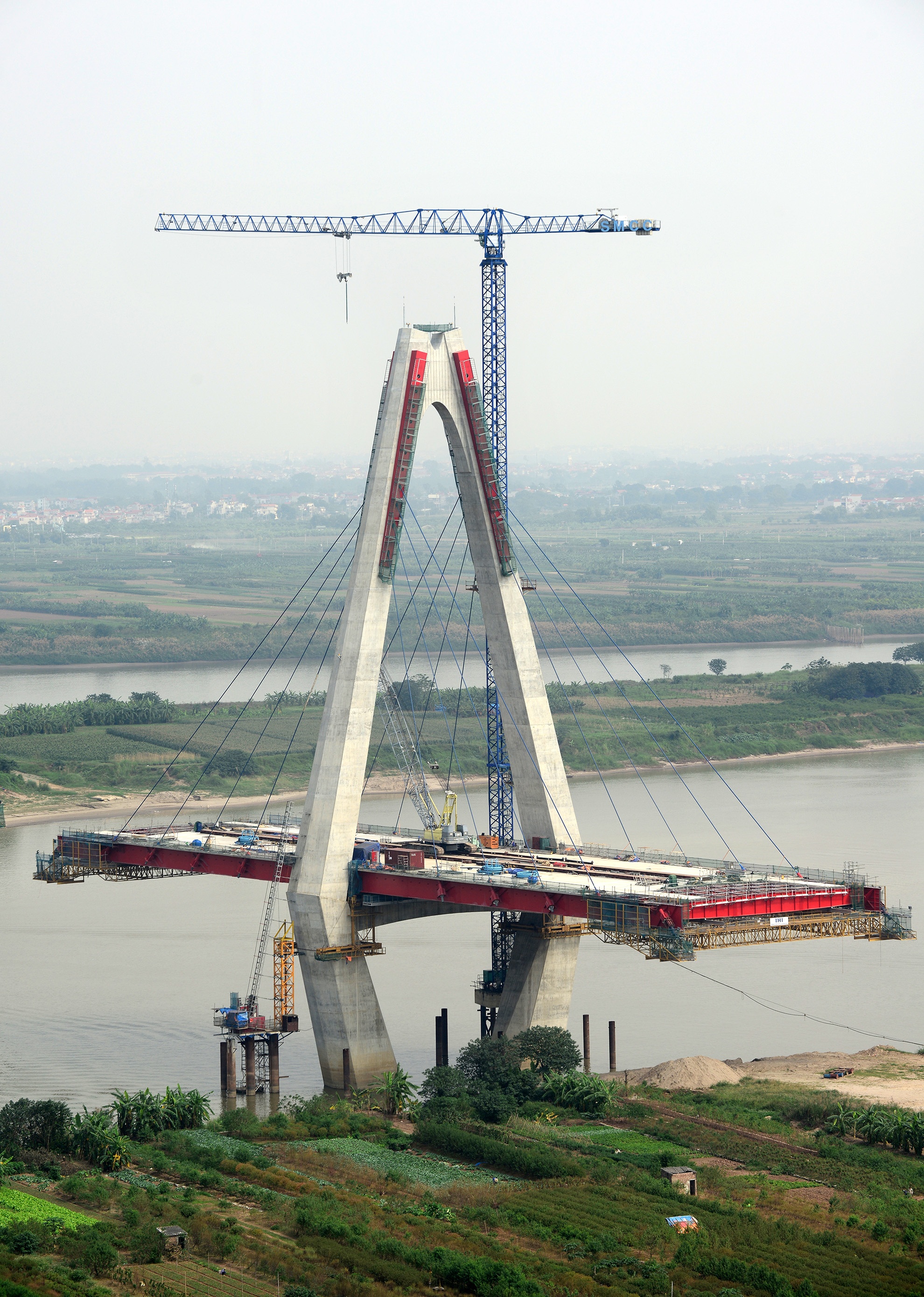 Hơn 4 năm sau ngày khởi công, trong đó có 2 năm chậm tiến độ, cây cầu dây văng dài nhất Việt Nam đã dần lộ rõ hình ảnh tráng lệ bắc qua đôi bờ sông Hồng.