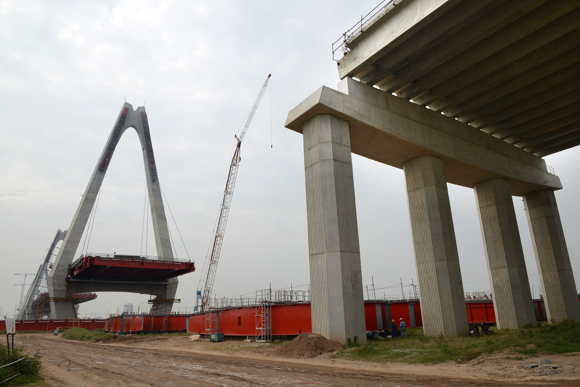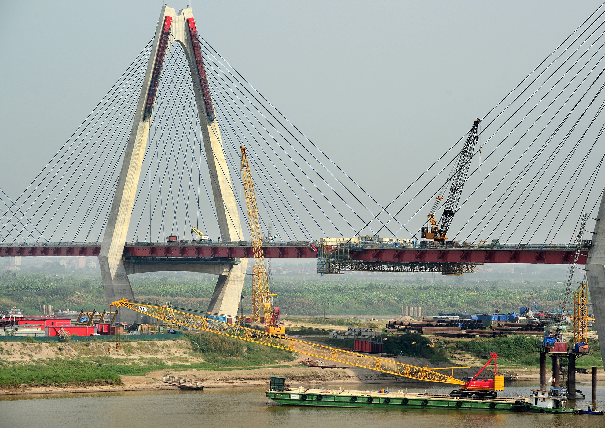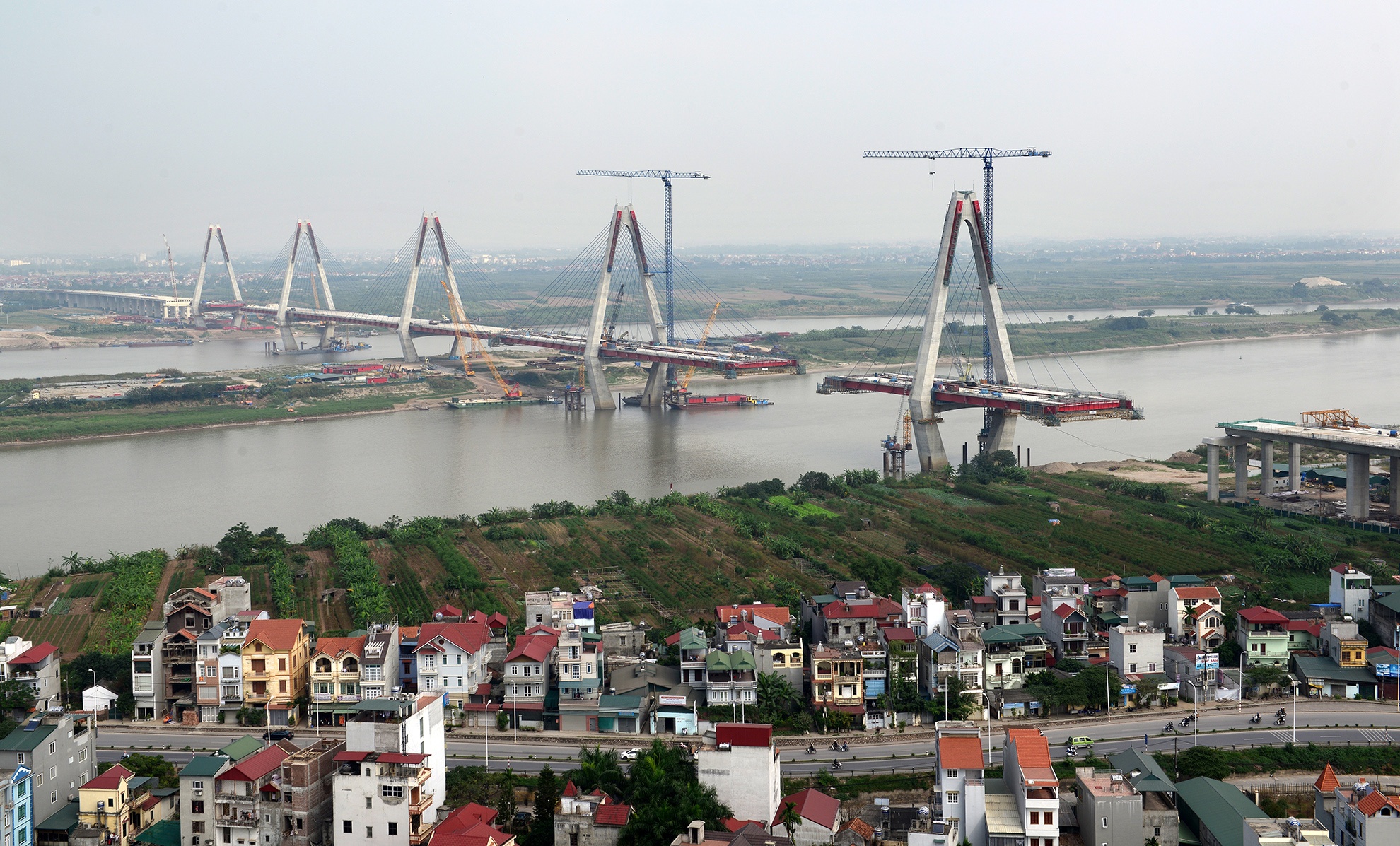 Hơn 4 năm sau ngày khởi công, trong đó có 2 năm chậm tiến độ, cây cầu dây văng dài nhất Việt Nam đã dần lộ rõ hình ảnh tráng lệ bắc qua đôi bờ sông Hồng.