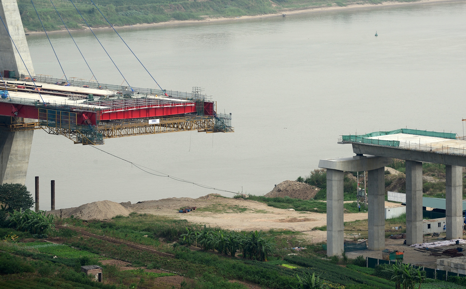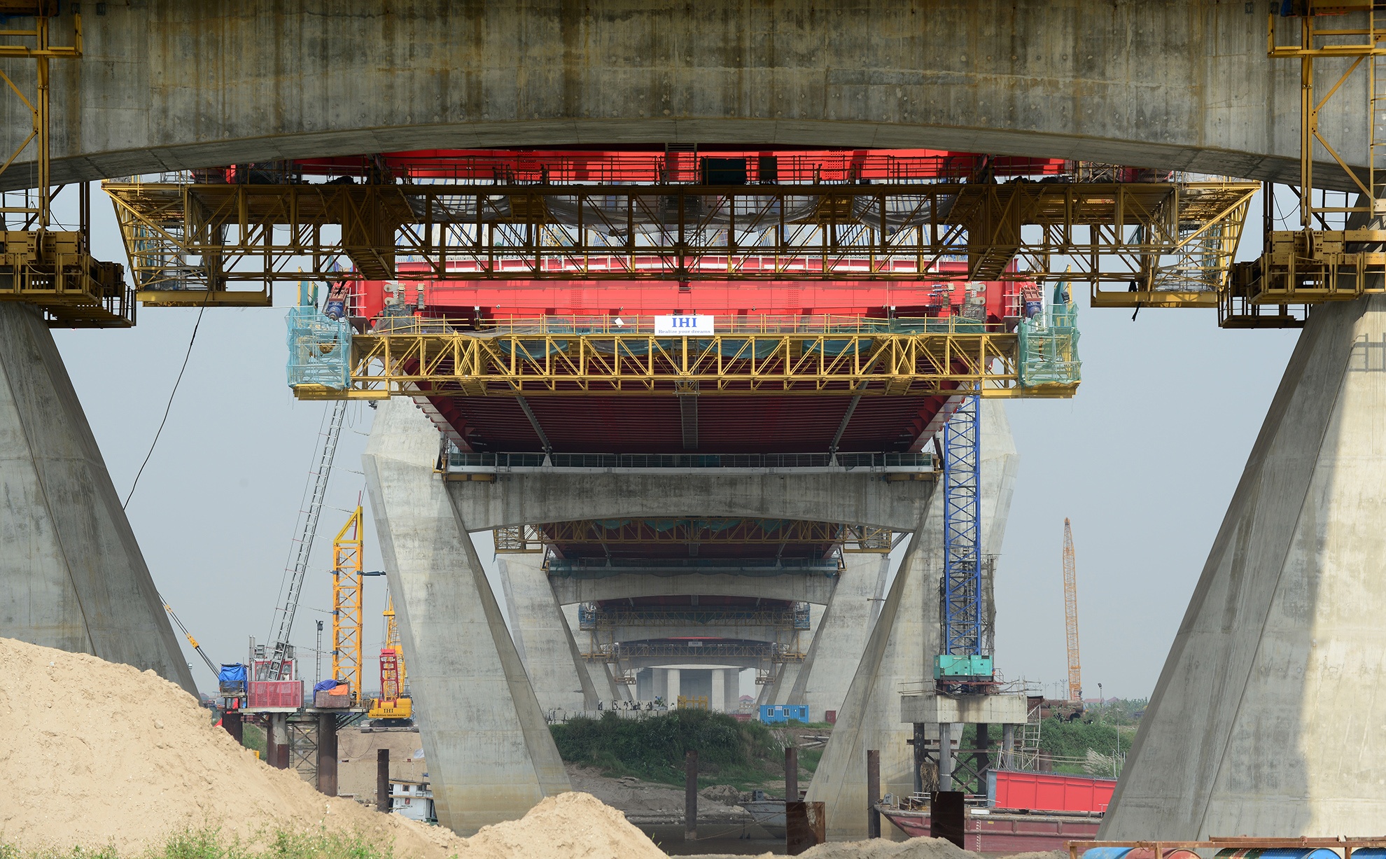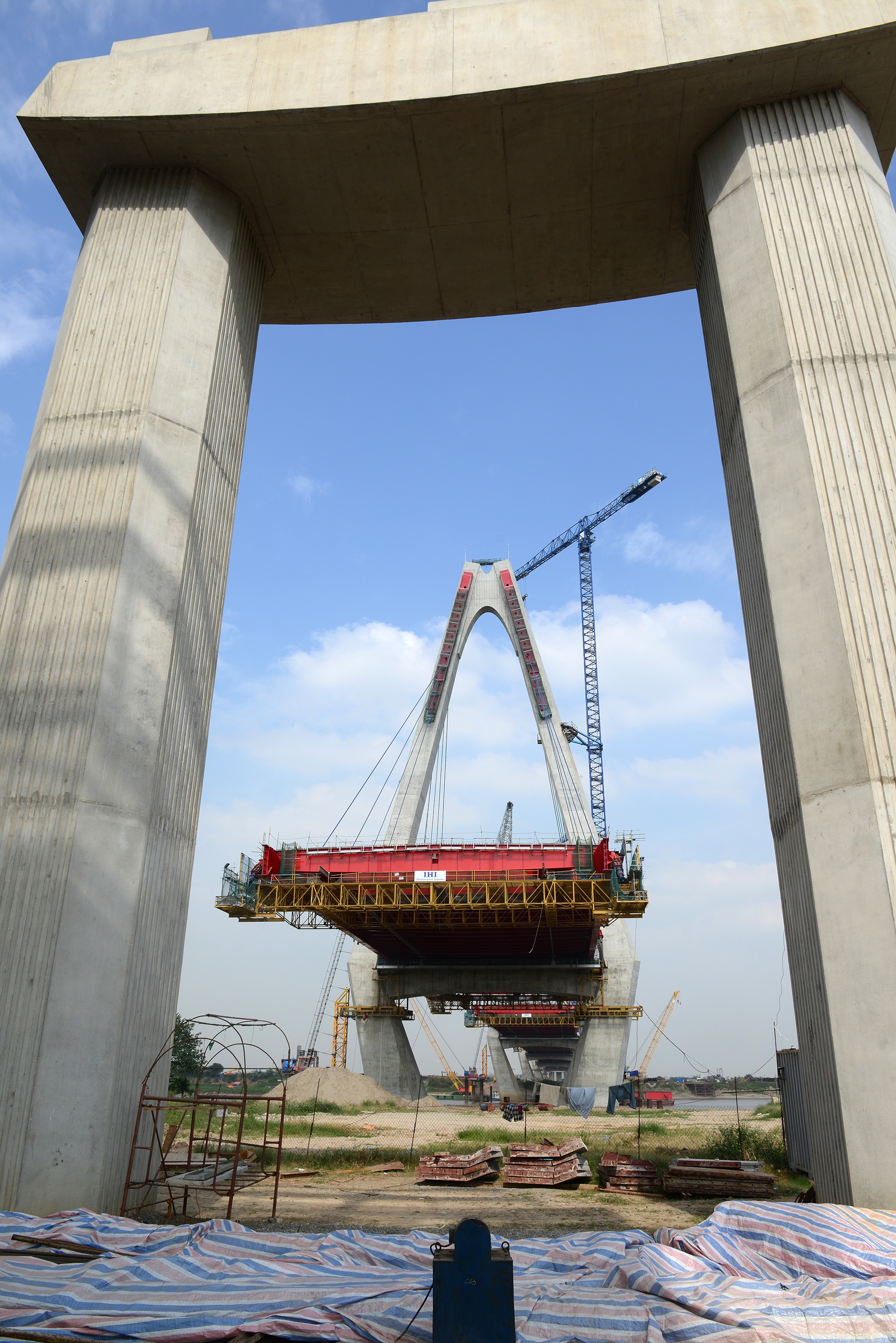 Cầu chính là cầu dây văng liên tục 5 trụ tháp với tổng chiều dài 1.500m (các nhịp chính có chiều dài 300m). Tại công trường thi công bên bờ Bắc, trụ tháp thứ 5 đang chuẩn bị được nối liền với đường dẫn.